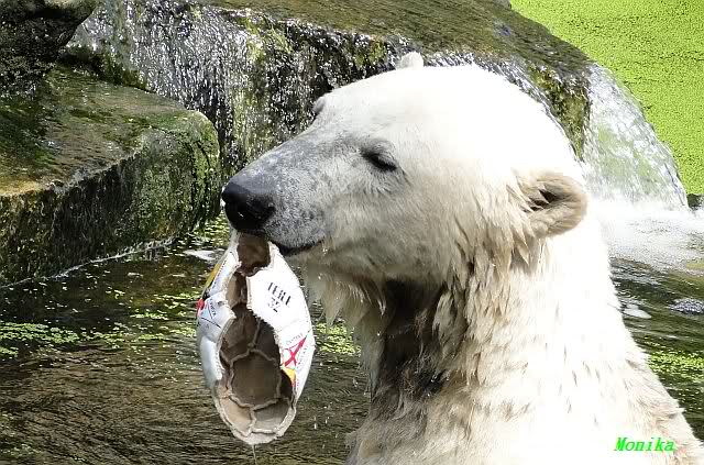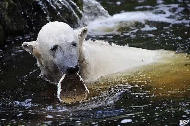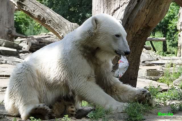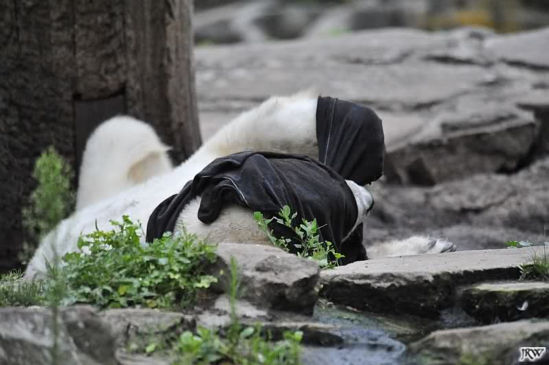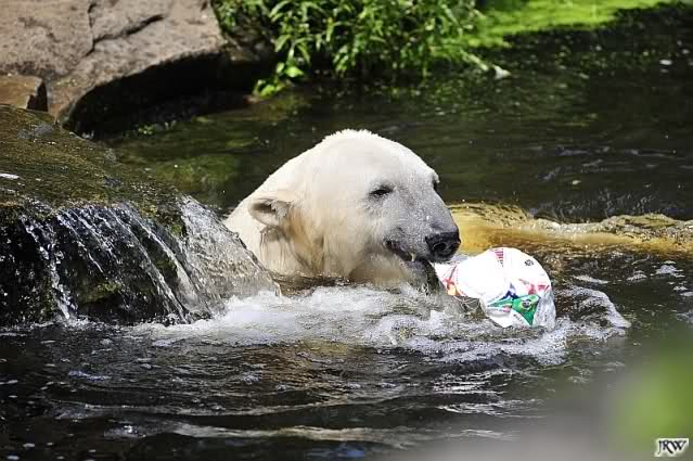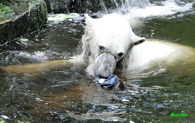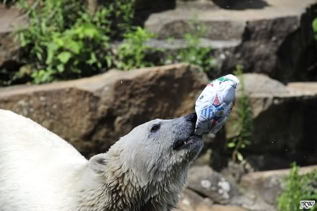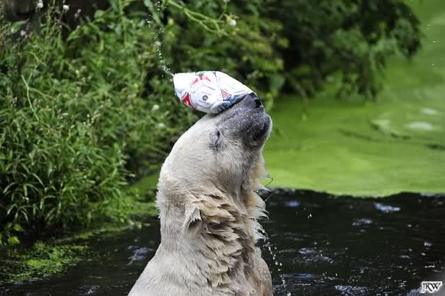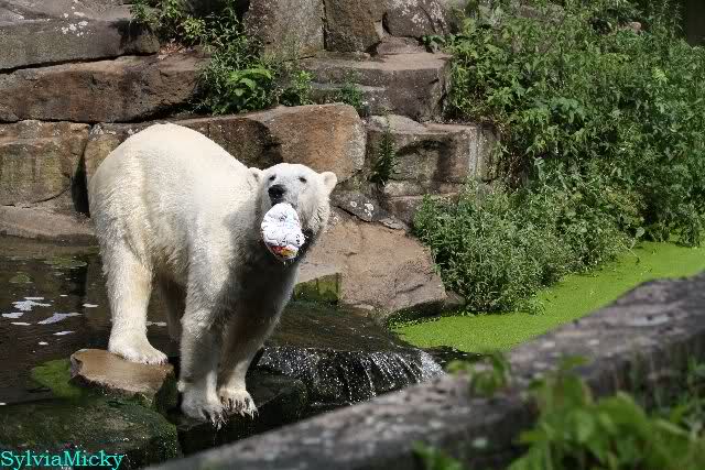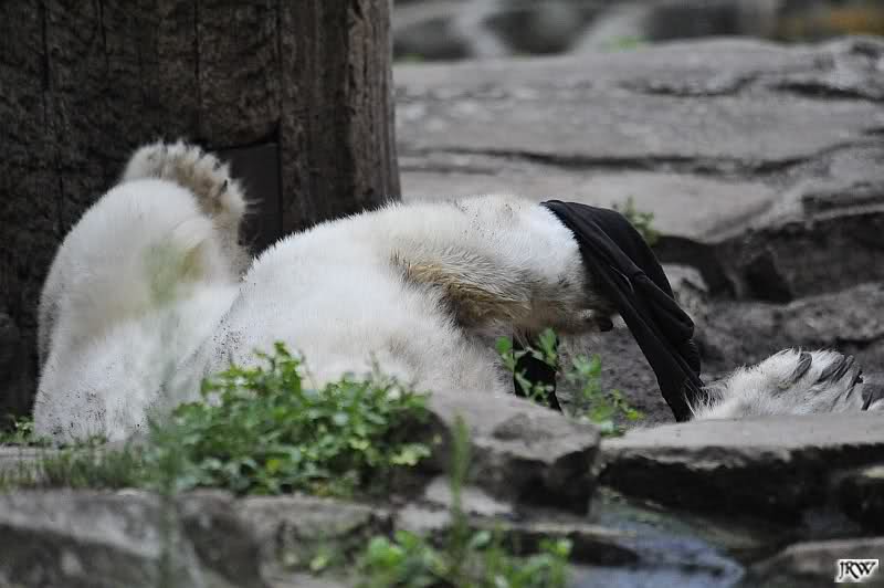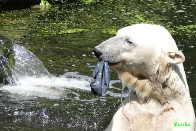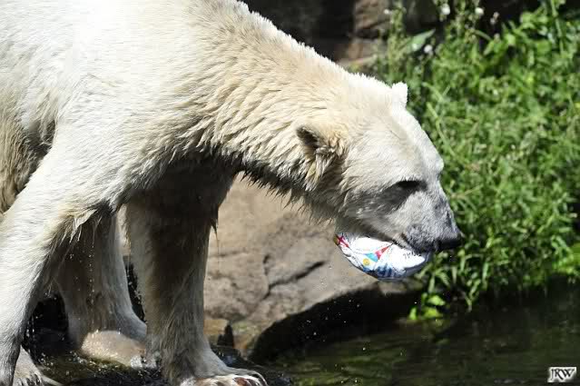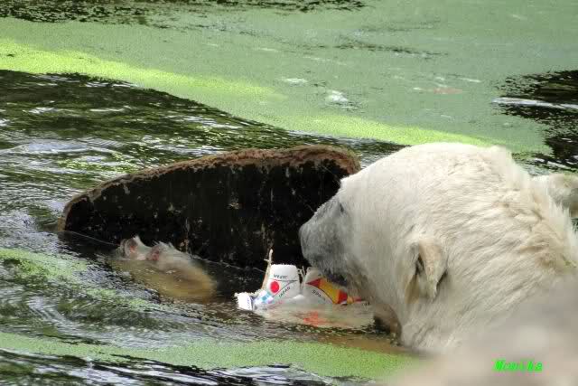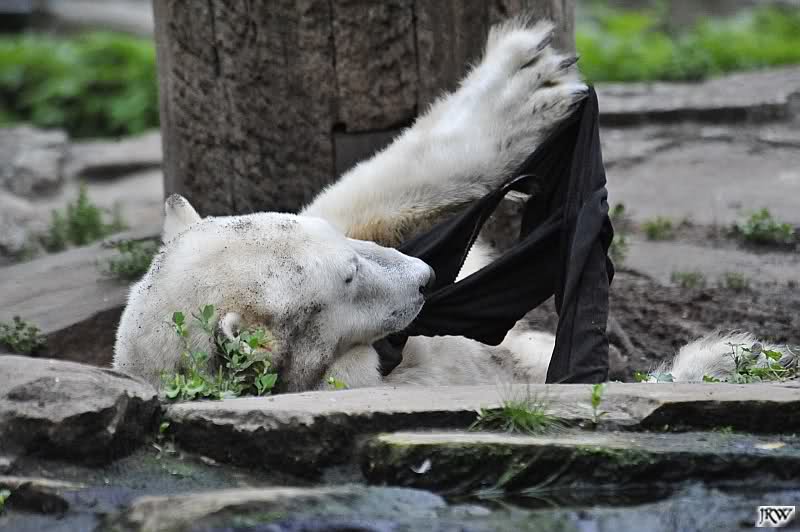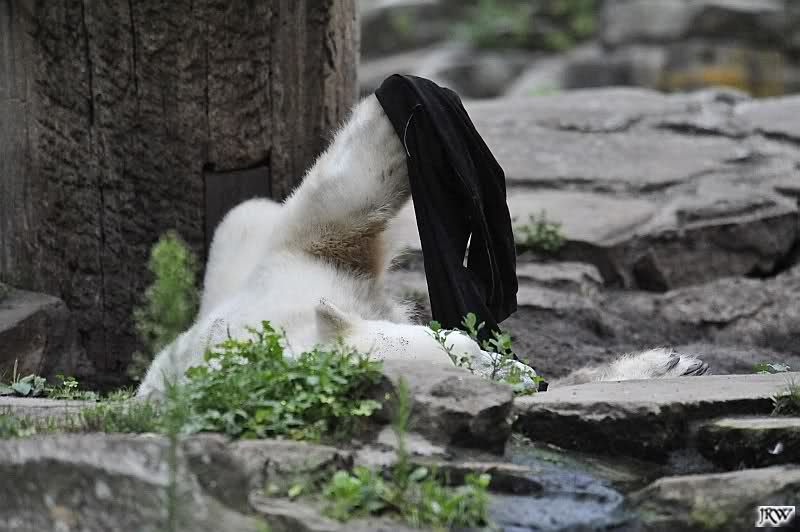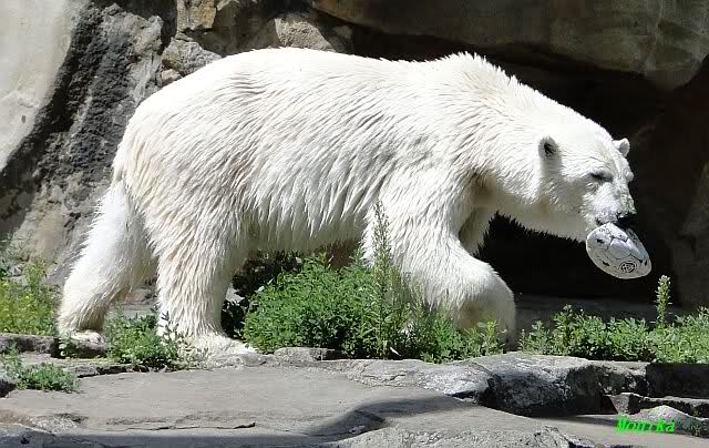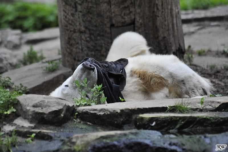 Knut warf den Ball einmal zu den Besuchern, als er zurück flog schnupperte er dran und ließ ihn liegen. Roch wohl nicht gut.