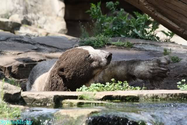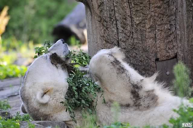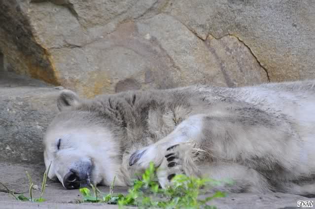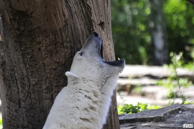 Wie Monika schon schrieb, war Knut heute früh äußerst aktiv. Als er sich in den Höhleneingang legte und Gianna zu ihm kam, brummte er sie an.