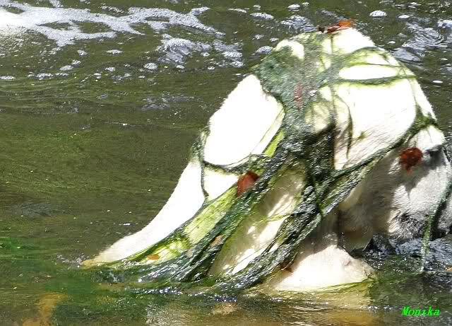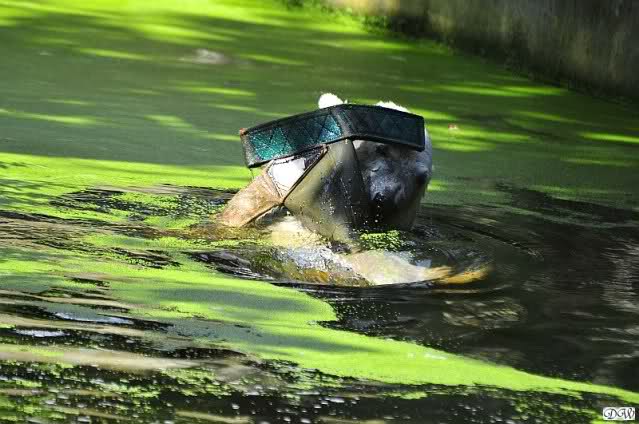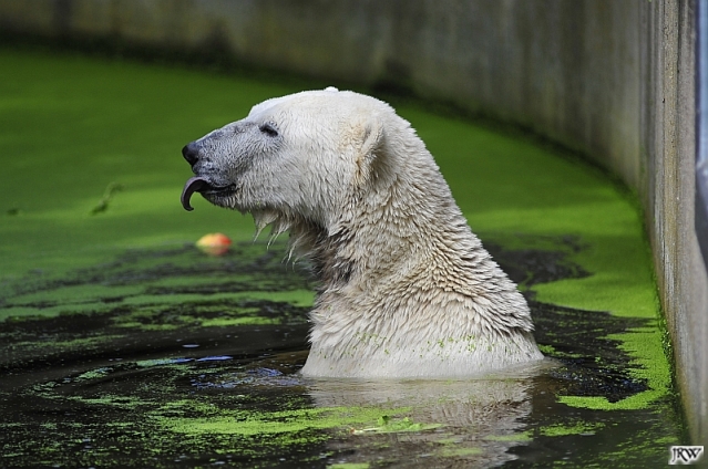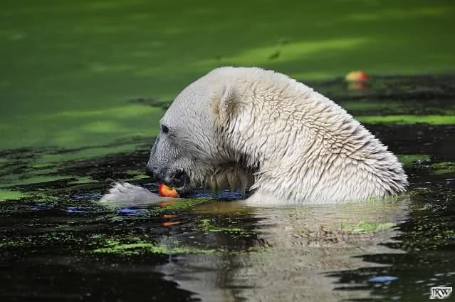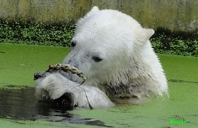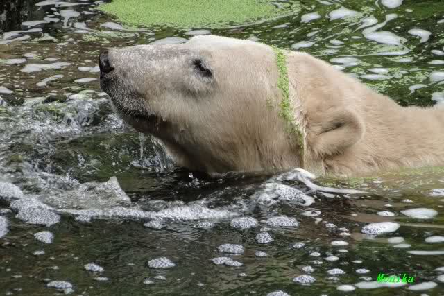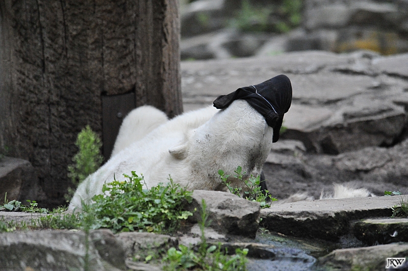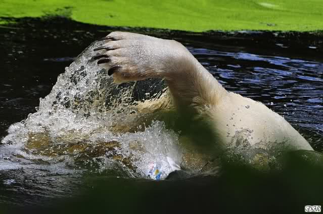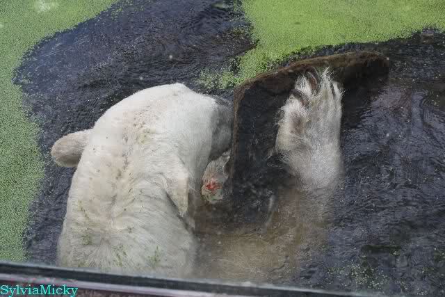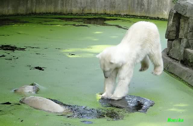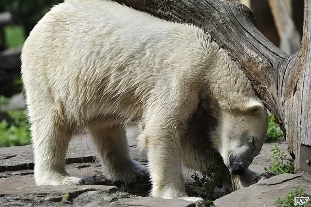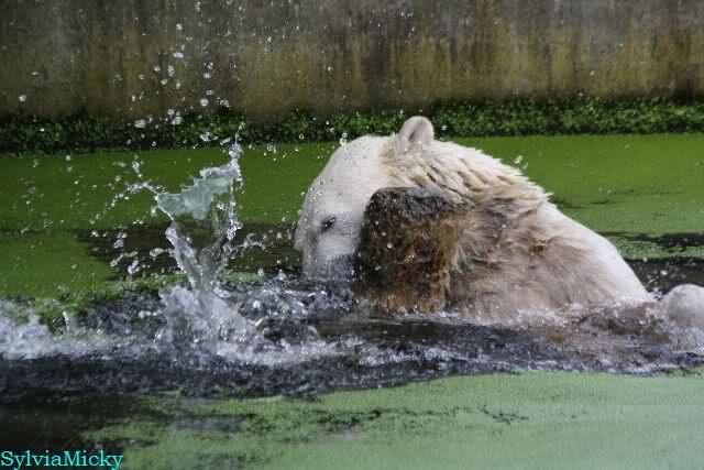 Heute Vormittag war Knut in Spiellaune. Er spielte mit den Bällen, Baumstamm und mit dem Brett. Sogar der alte Ochsenschwanz kam wieder zum Vorschein. Das schönste jedoch war, das Knut und Gianna nach langer Zeit ein paar Minuten zusammen im Wasser spielten. Anschließend färbte Knut sich wieder ein.