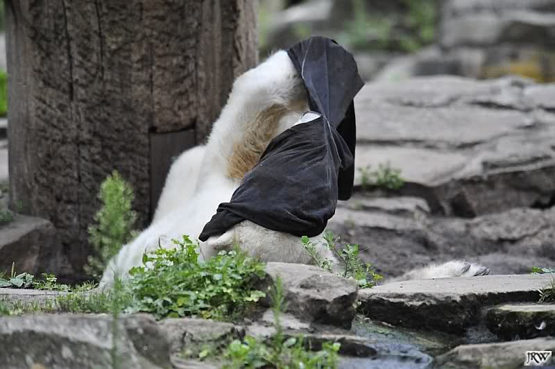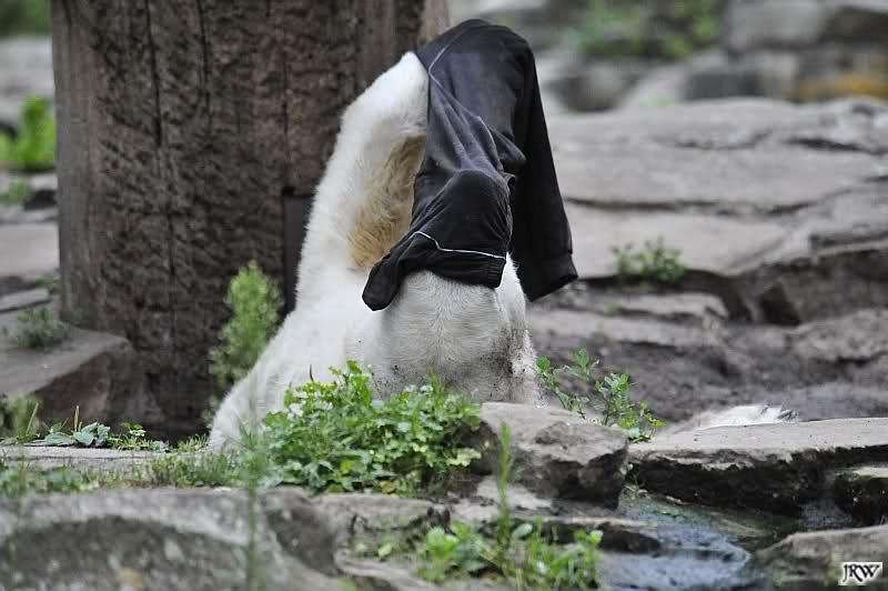 Wenige Tage vor ihrer Abreise bekam Gianna auch heute keine Möhre oder auch nur einen Apfel auf die Anlage geworfen. Knut beeilte sich und fraß restlos alles auf, immer nach oben schauend, ob sie denn etwas schon käme. Als Gianna auf die herauskam, stürzte sie sofort hinunter und suchte alles ab. Später nahm sie seinen Ball und trug ihn nach oben vor den Höhleneingang.