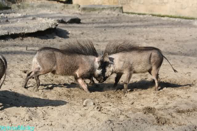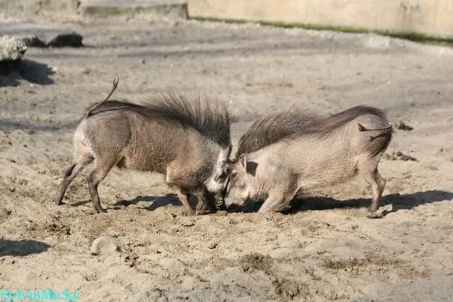 Sie kämpfen immer noch. Ich sehe aber nur zwei bei den Warzenschweinen. Wo ist das Dritte?
