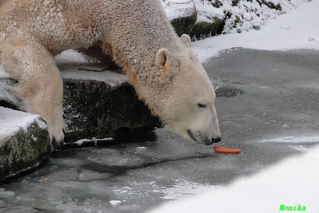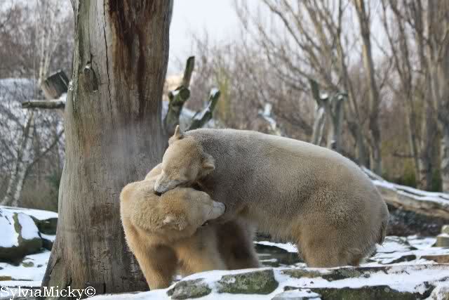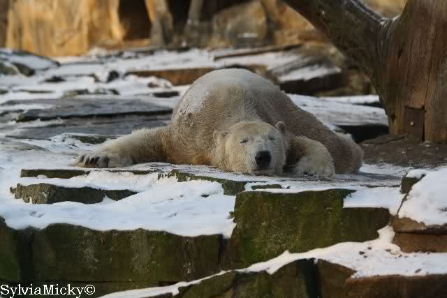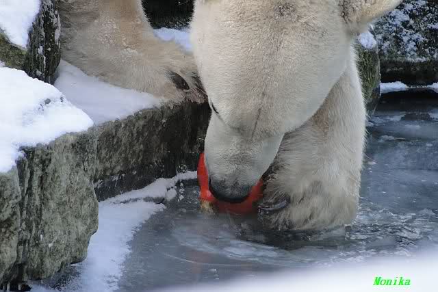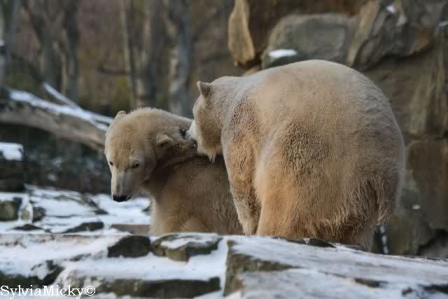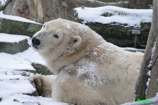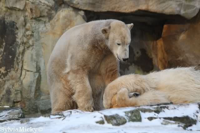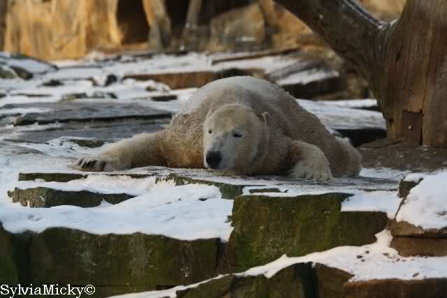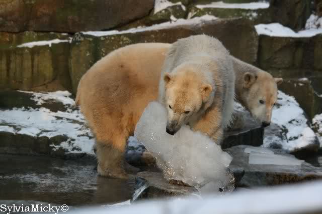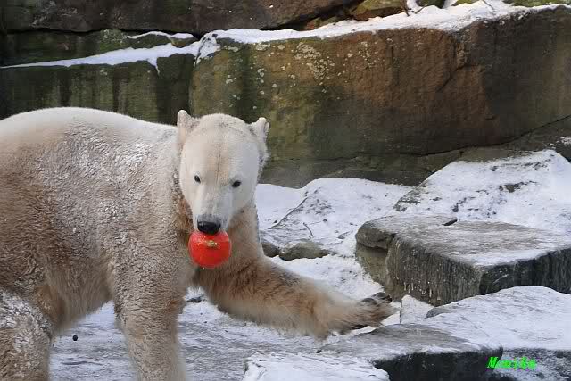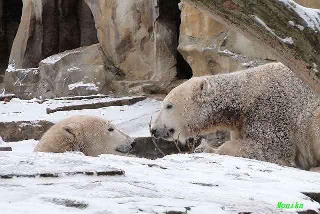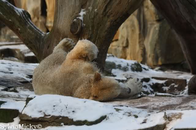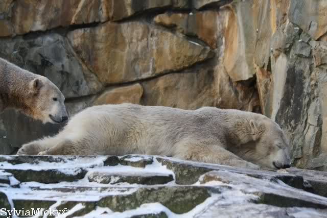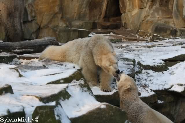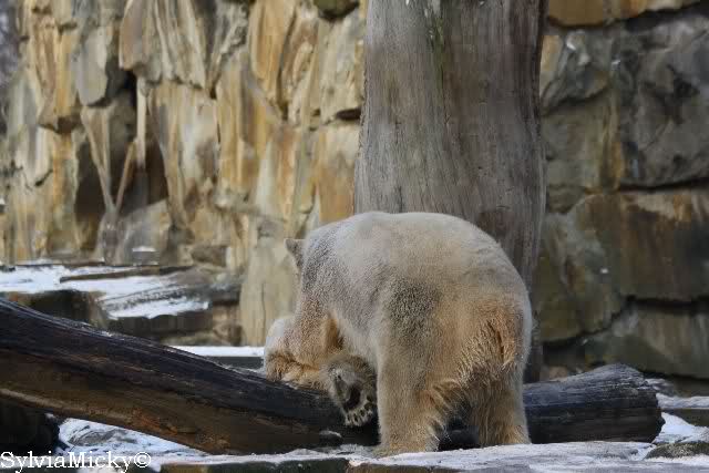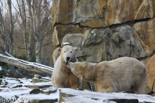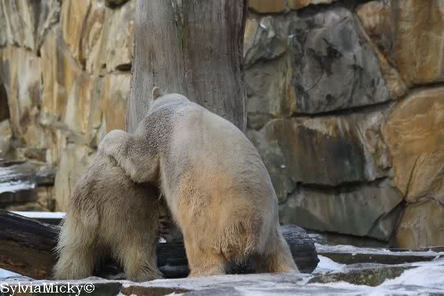 Heute Vormittag wurde wieder geschmust und über den Schnee gerutscht. Gianna holte sich eine Eisscholle aus dem Wasser. Knut wollte ihr nacheifern. Leider erwischte er eine sehr große, die er nicht aus dem Wasser ziehen konnte. Die meisten Tiere waren heute in ihren Stallungen oder Höhlen. Bei einigen die draußen waren sah man, daß ihnen die Kälte nicht gefiel. Nur Gianna und Knut tobten über die Anlage und die Robben schwammen vergnügt im Wasser. Gianna lief zeitweise vor Knut weg, wenn er zu stürmisch wurde. Es war wieder mal eine Freude ihnen zuzusehen. Bei gefühlten -30° bin ich gegen Mittag gegangen.