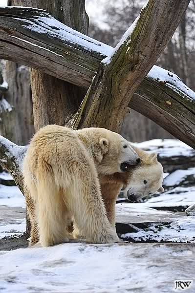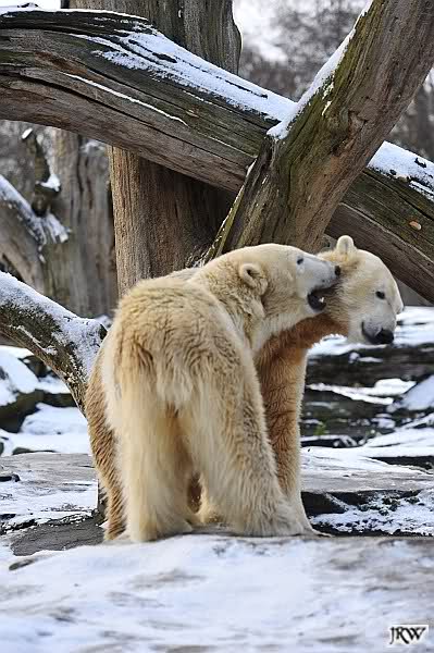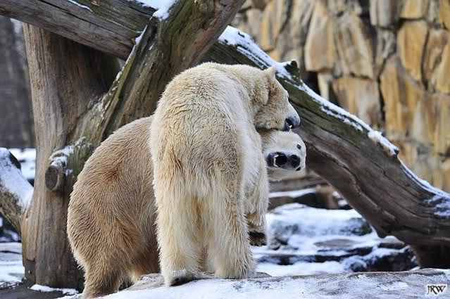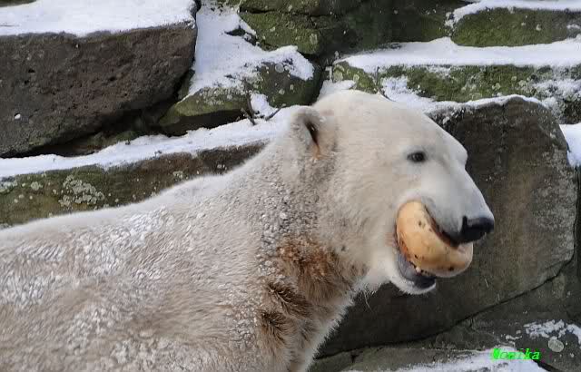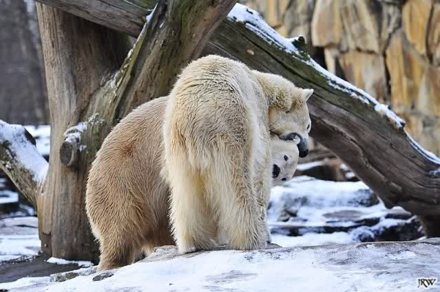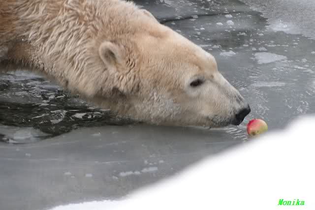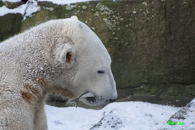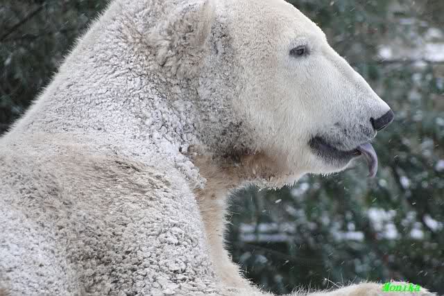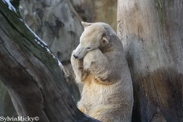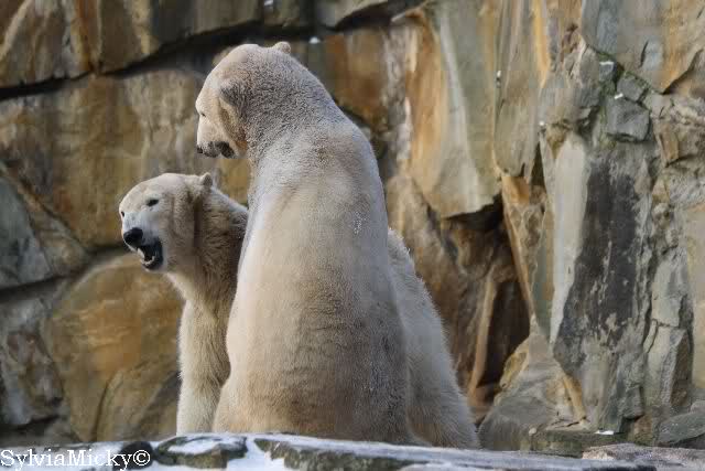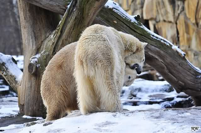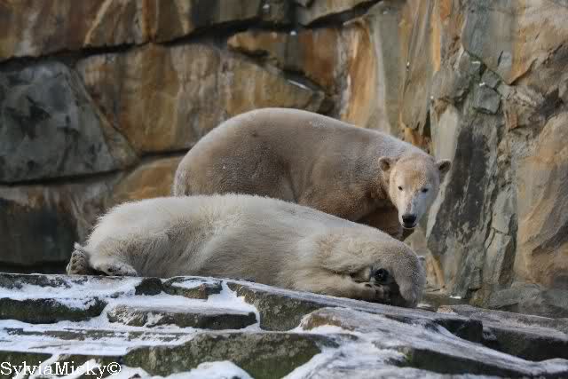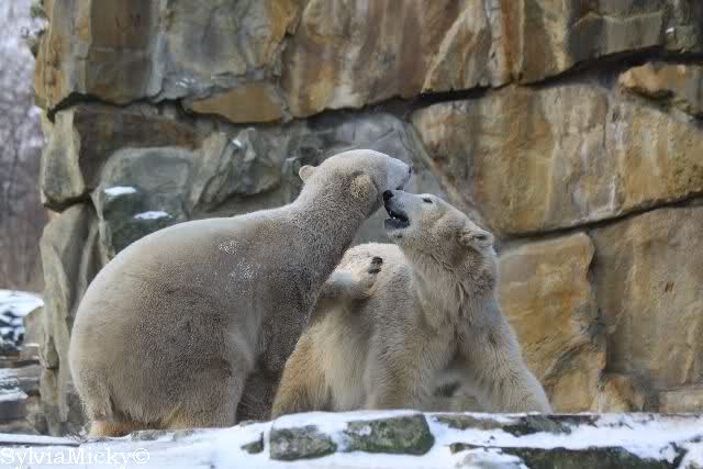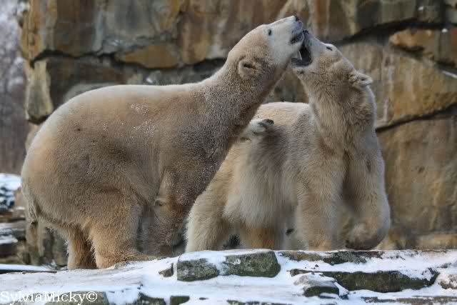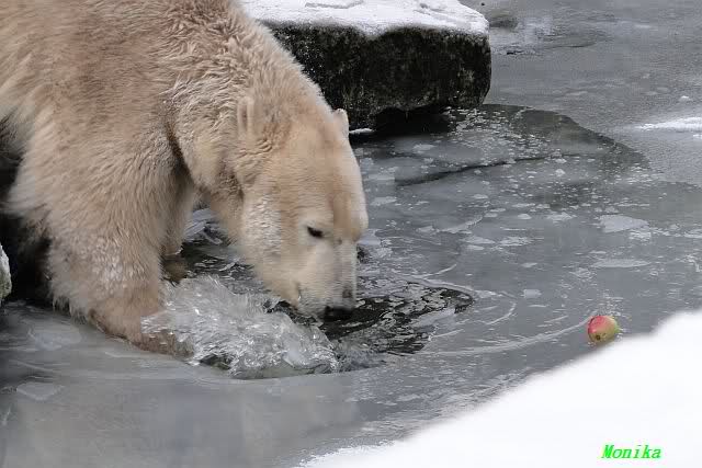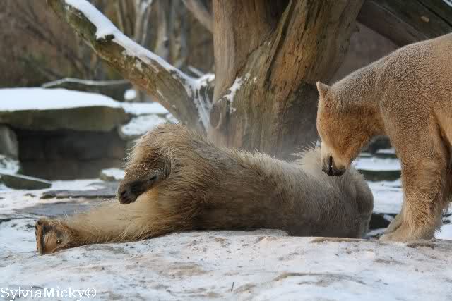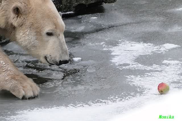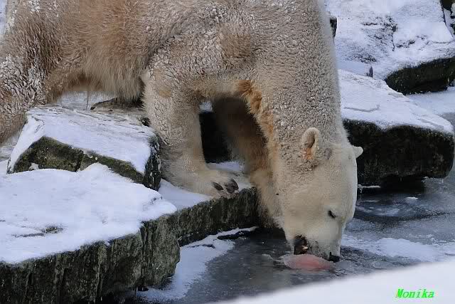 Heute Vormittag wurde wieder geschmust und über den Schnee gerutscht. Gianna holte sich eine Eisscholle aus dem Wasser. Knut wollte ihr nacheifern. Leider erwischte er eine sehr große, die er nicht aus dem Wasser ziehen konnte. Die meisten Tiere waren heute in ihren Stallungen oder Höhlen. Bei einigen die draußen waren sah man, daß ihnen die Kälte nicht gefiel. Nur Gianna und Knut tobten über die Anlage und die Robben schwammen vergnügt im Wasser. Gianna lief zeitweise vor Knut weg, wenn er zu stürmisch wurde. Es war wieder mal eine Freude ihnen zuzusehen. Bei gefühlten -30° bin ich gegen Mittag gegangen.