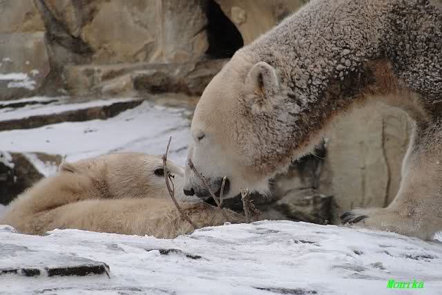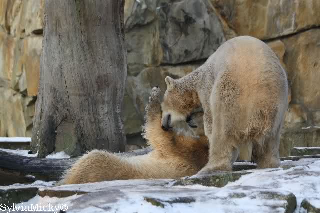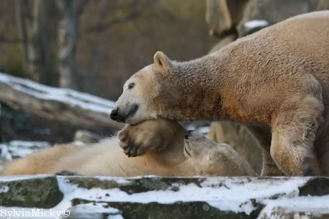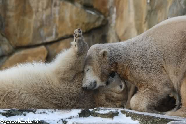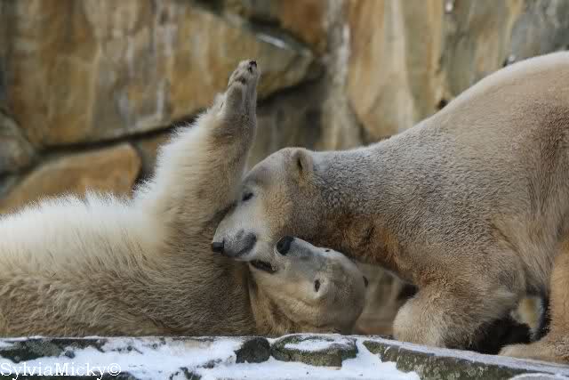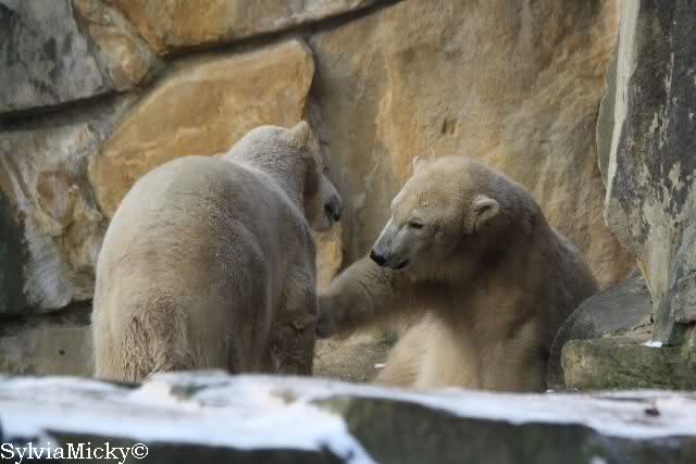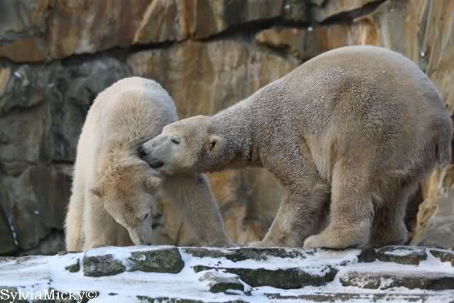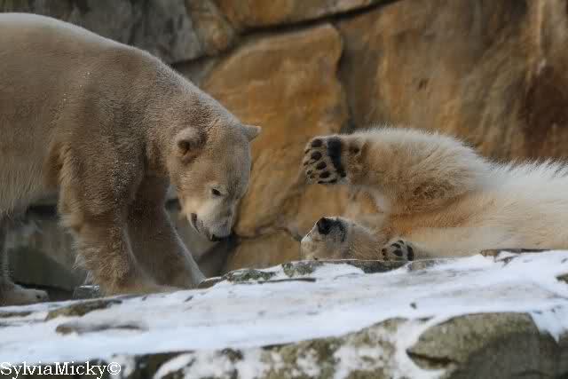 Die Eisbärin Corinna z.B. ist ganz verzückt von dem Öhrchen ihres Antons. Sobald sie zusammen auf einer Anlage sind, geht sie zu ihm und knabbert begeistert an seinem rechten Ohr.