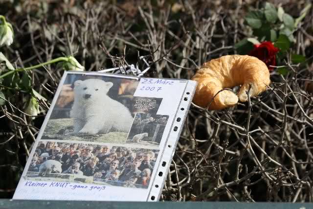 Heute kam ich schon früh am Zoo an, kurz nach neun. Vor dem Zaun, gegenüber der Alpaka-Anlage, hatten in den vergangenen Tagen trauernde Besucher unzählige Blumen abgelegt. Brennende Kerzen leuchteten. Zwischen den Blumen und am Zaun hingen viele Briefe, Abschiedsbriefe für Knut. Viele Briefe waren mit Fotos von Knut und Thomas Dörflein geschmückt. Ich sah auch viele Kinderzeichnungen und Briefe von Kindern. Sie drückten auf besonders anrührende Weise ihren Kummer um Knut aus.