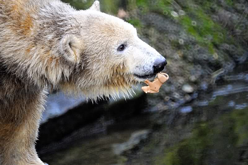 Eines Tages fand Knut ein kleines Playmobil Pferd aus Plastik in seinem Graben. Wahrscheinlich ist es einem Kind hineingefallen. Als wir sahen, womit er spielte, machten wir uns Sorgen. Ein zu fester Biss und er hätte es verschlucken und sich verletzen können. Wir erzählten TD davon, er sah das Pferdchen an und sagte es sei ok. Er kannte seinen Bären- Unsere Sorge konnten wir bald vergessen, denn Knut spielte ganz sanft mit diesem kleinen Teil. Er legte es zart an seine Wange und auf seinen Bauch, jonglierte damit und hatte unglaublich viel Freude daran. Es war so rührend zu sehen, wie er mit dem Pferdchen umging. Es ging nicht kaputt, Monate später fand er es wieder im Wassergraben und das Spiel begann von vorn.