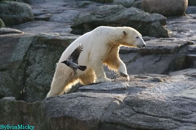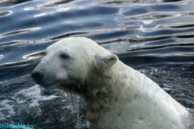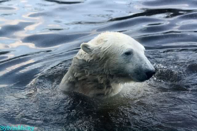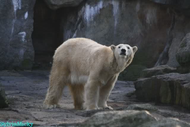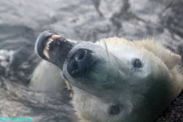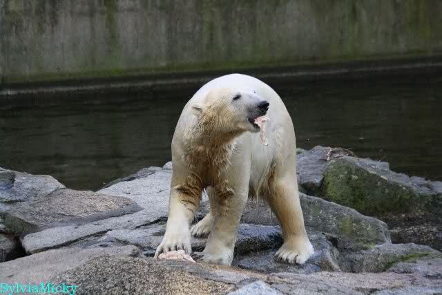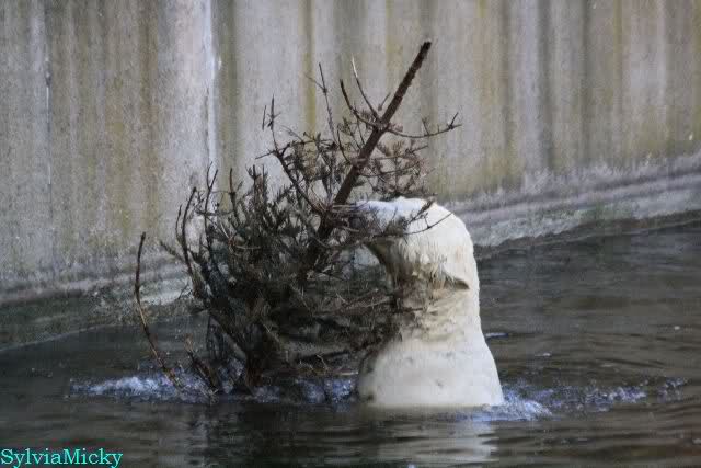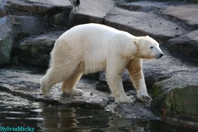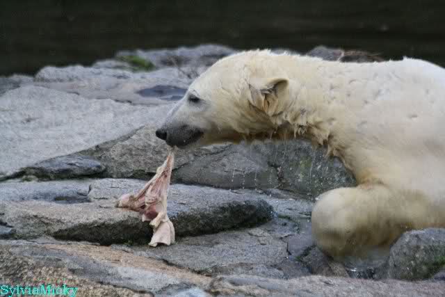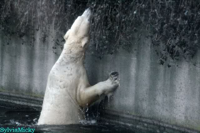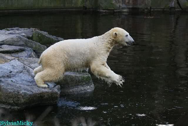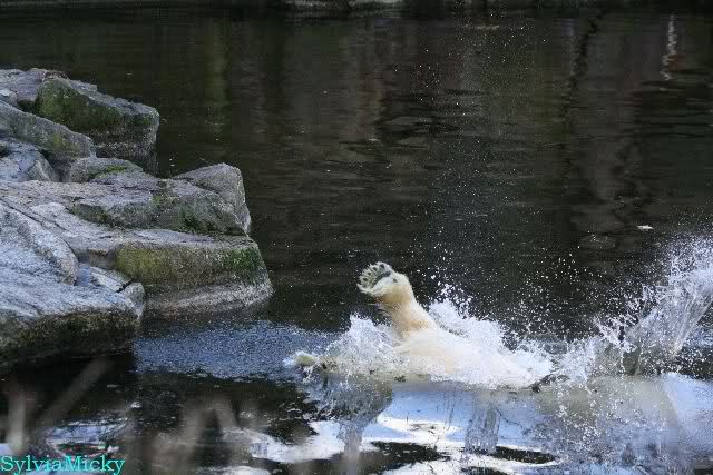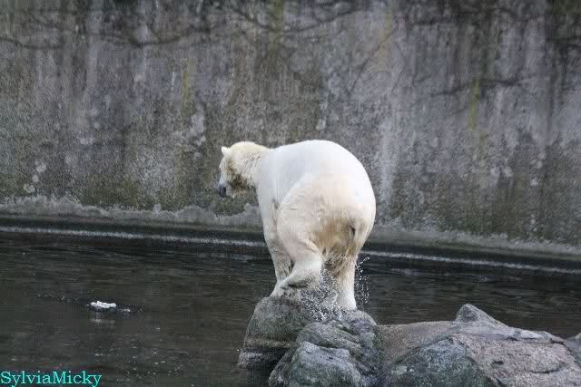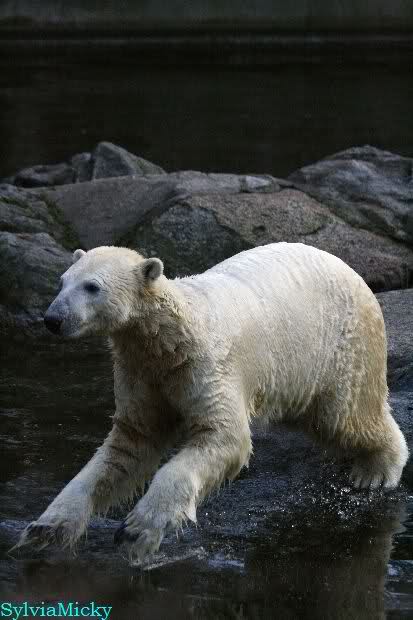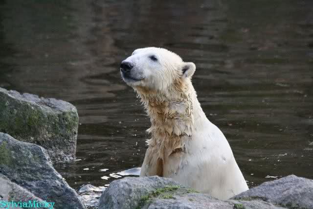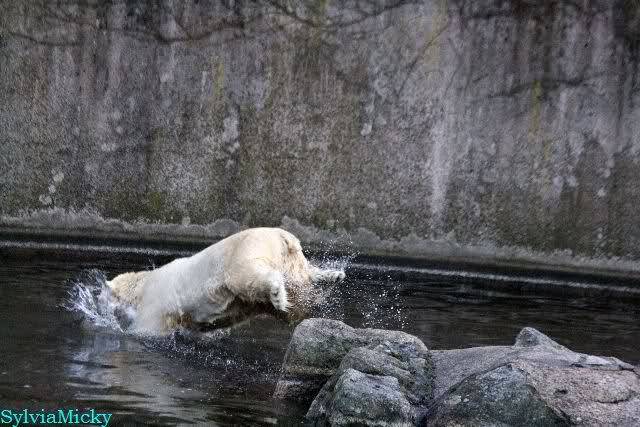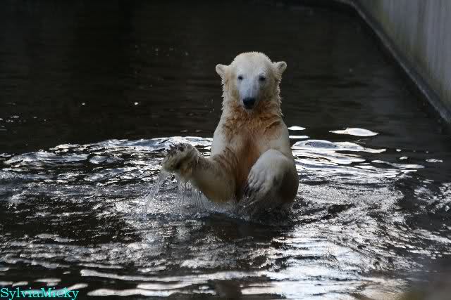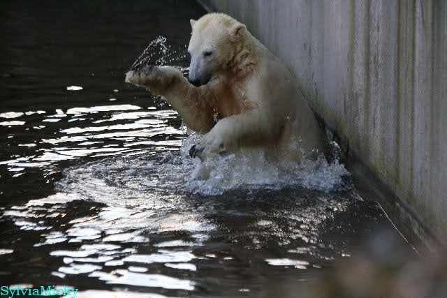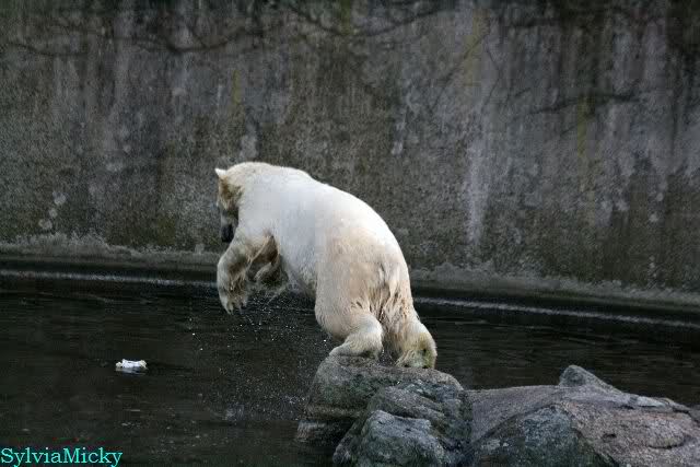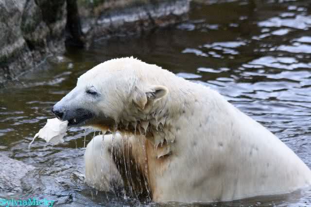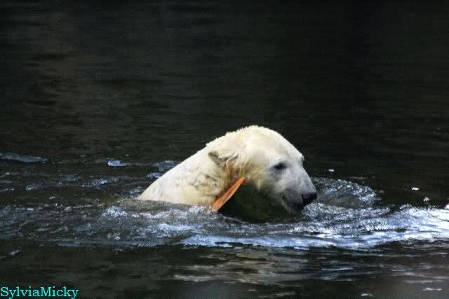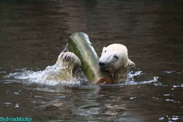 Thanks to Sylvia for the new pictures from Zoo at afternoon today. Nancy is back and Knut was playing in water a long time. He was so happy to got a new *natural toy*. A young polar bear need it so much.