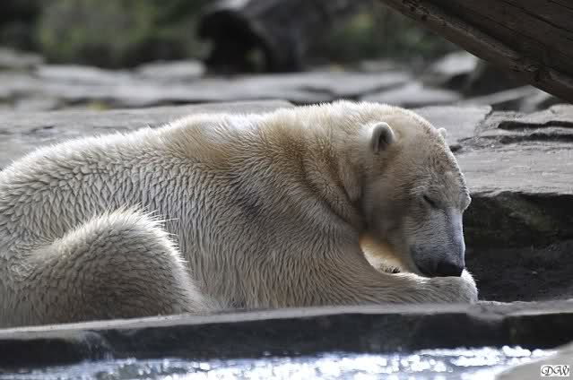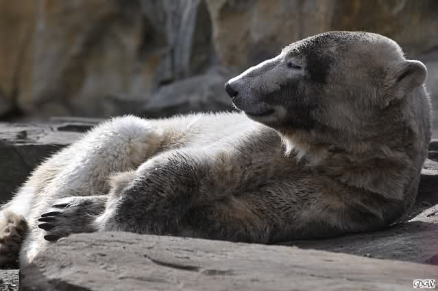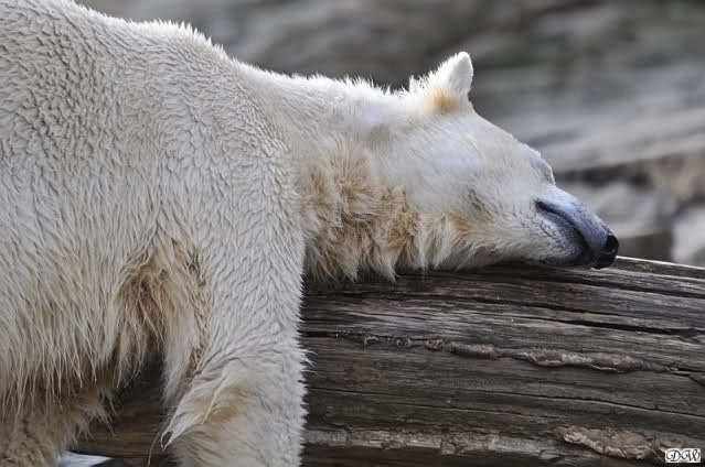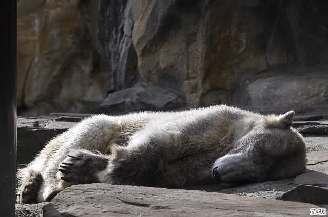 Zunächst gingen wir zu Knut und Gianna. Knut hatte sich in seine Sandkuhle gekuschelt und schlief. Gianna wanderte oben auf der Anlage herum. Nun, dann konnten wir auch eine Zoo-Runde drehen.