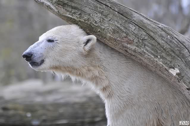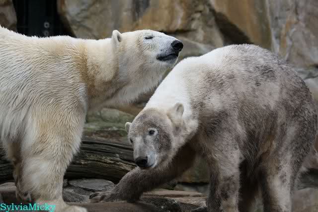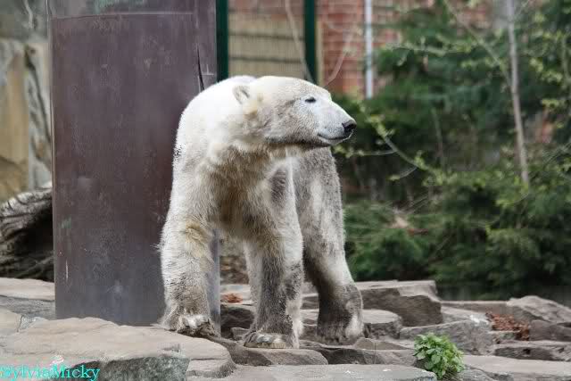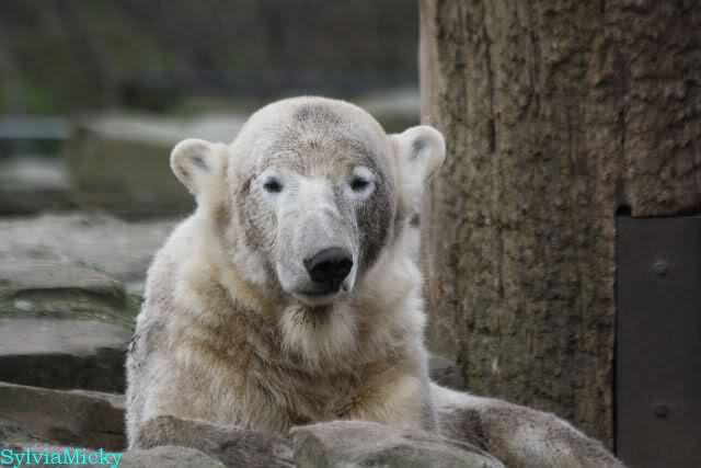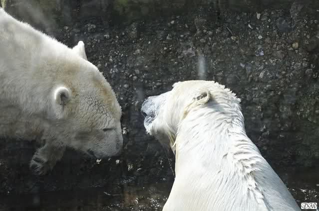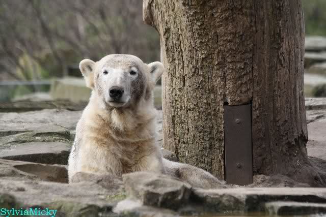 Die beiden machten heute Morgen nicht viel. Vielmehr schlichen sie um den Blechbaum und auch umeinander herum wie Falschgeld. Deshalb ging ich weiter zu den großen Eisbären. Heute war der Zoo vormittags schon ziemlich voll und auch beim Eisbärengehege drängelten sich die Besucher wie zu alten Zeiten. Natürlich wollten wieder viele Leute wissen, wer von den drei Eisbären denn Knut ist. Ich wollte schon um eine Anstellung im Zoo bitten, sozusagen als wandelnde Auskunft.