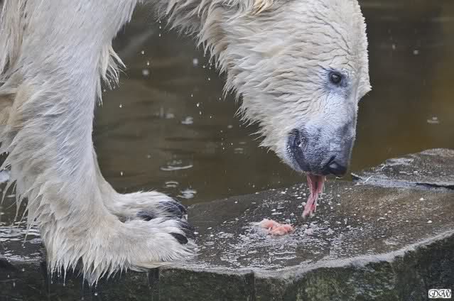Dann gingen wir zu Knut. Gianna war schon in der Höhle. Nach kurzer Zeit kam Herr Röbke mit dem Futter. Knut bekam heute ein große Portion Futter; ich dachte schon, der Eimer wird überhaupt nicht mehr leer. Vor allem gab es mehrere schöne, große Fische. Herr Röbke machte Knut wieder Bewegung, indem er die wirklich interessanten Dinge wie Fische und Fleisch ins Wasser warf. Knut ließ sich ins Wasser krachen. Er bekam das Futter und wir eine Dusche.