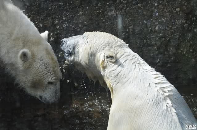 Beide Bären toben schon seit Vormittag im frischen Wasser. Offensichtlich hat die Reinigung der Anlage, wider Erwarten des Zoopersonals, nicht so viel Zeit beansprucht wie anfangs angenommen.