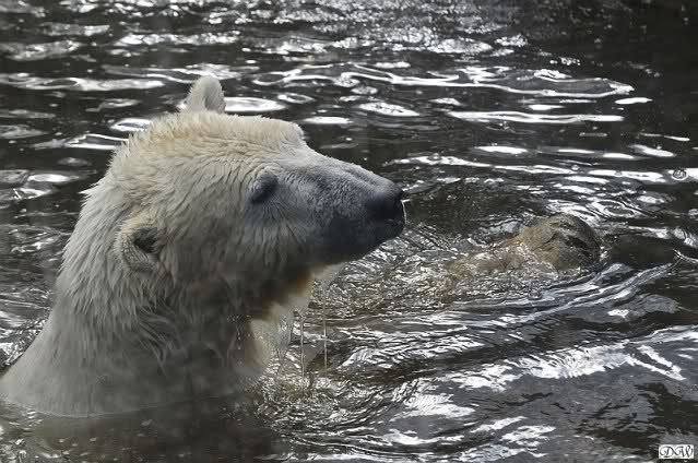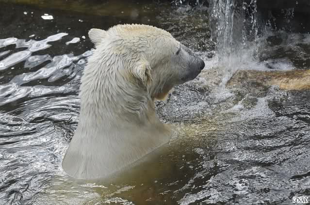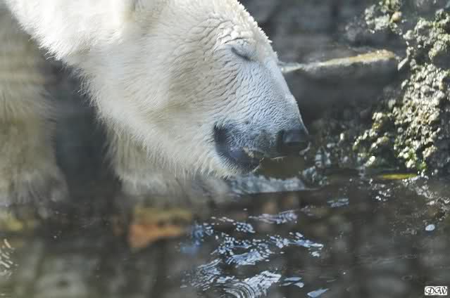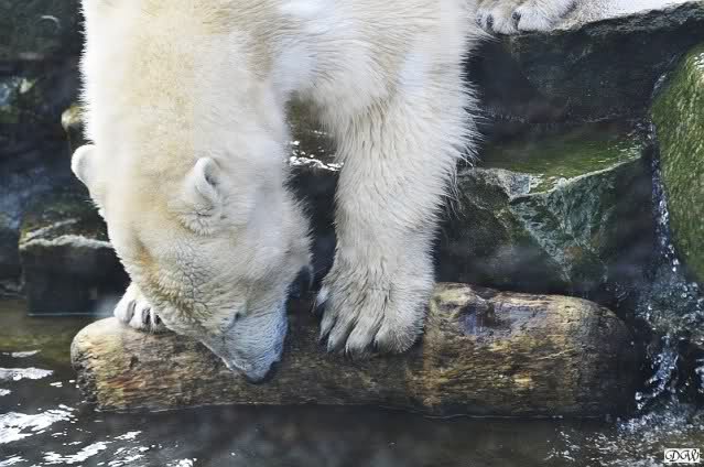 Weniger schön fand ich, dass wieder Kinder oben auf dem Felsen neben Knuts Gehege standen. Die Erwachsenen sagten nichts dazu. Im Gegenteil, sie reichten den Kindern noch Kameras hoch, damit sie tolle Bilder von den im Wasser spielenden Eisbären machen sollten.