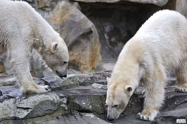 Knut verbrachte am Nachmittag viel Zeit in der hintersten Ecke des Wassergrabens. Er spielte mit kleinen Dingen und war offensichtlich zufrieden mit sich und der Welt. Gianna musste immer wieder nachschauen, was er denn dort tun könnte. Sie kletterte waghalsig den Felsen hinunter und wieder hoch, es kam zu Kontakten zwischen Beiden, die sie aber oft im toten Winkel hatten. Knut beäugte sie danach sehr misstrauisch.