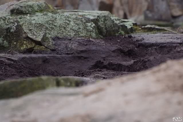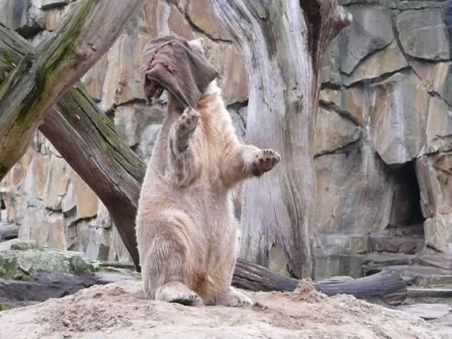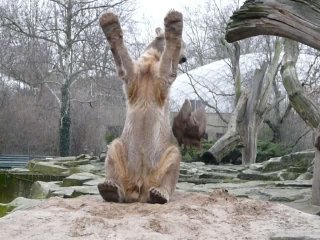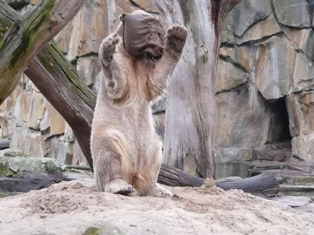 als wir heute in den Zoo kamen berichtete man uns, dass Knut heute viel geschlafen hat. Kein Wunder bei dem Wetter. Selbst seinen Hungermarsch begann er spät. Aber natürlich schläft er nie den ganzen Tag egal wie das Wetter sein mag. Er grub sich heute ein besonders großes Loch. In einem schlief er, in dem anderen sühlte er sich mit großem Behagen. Somit trug er wieder Tarnfarbe. Nach der Fütterung, wieder schön sauber, begeisterte er seine von weit her angereisten, sowie auch die lokalen Besucher mit Jutesack-Kunststücken.