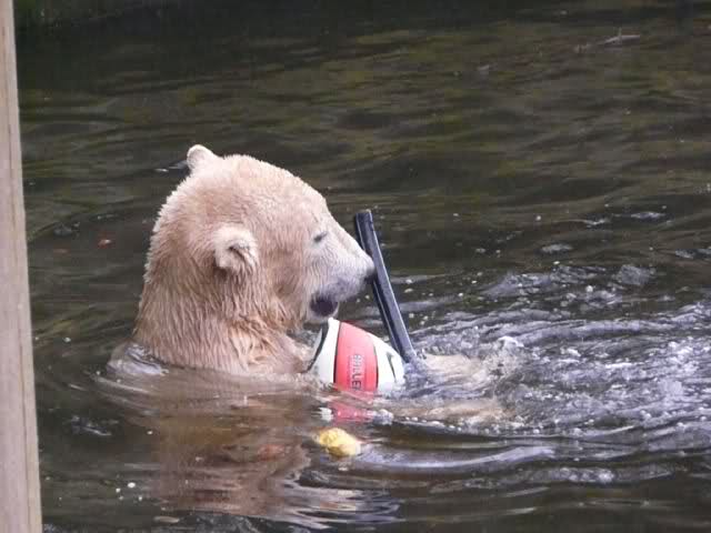 Nach der Fütterung spielte Knut wieder sehr lange im Wasser und auch mit den Besuchern wieder Ball. Wegen des naßkalten Wetters und den Regengüssen zwischendurch waren etwas weniger Besucher da als gestern. Trotzdem war es bei der Fütterung wieder voll und eine sehr gute Stimmung. Es waren auch noch viele nette Geburtstagsgäste da.