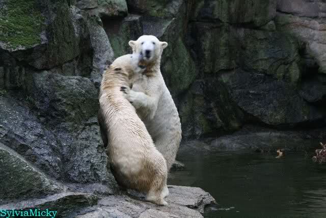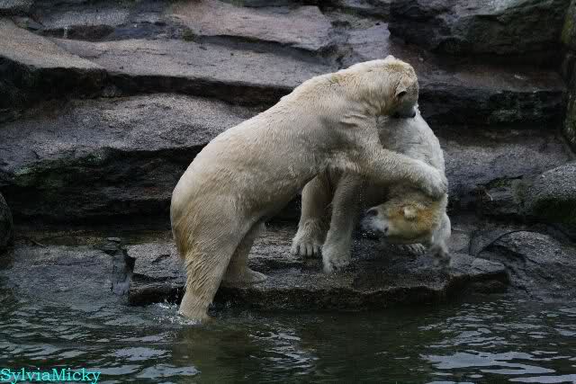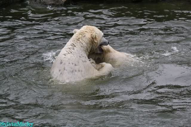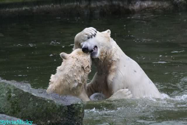Das Spielen von Knut und Tosca sieht brutal aus. Das sind eben die Bärenkräfte. Auf den Bildern mit Tosca auf Knuts Rücken sieht es so aus, ob Knut brüllen würde: "Geh von meinem Rücken!"