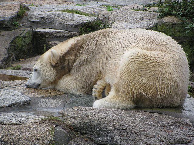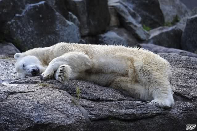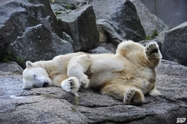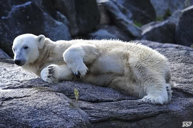 Knut liegt entspannt vorne auf dem Felsen, Tosca hat einen ganz zarten Annäherungsversuch gestartet, hat sich Knut langsam angenähert und ihm ein Küsschen gegeben. Knut hat sich dabei ein wenig erhoben, sich aber gleich wieder hingelegt. Ansonsten läuft Tosca hin und her und Nancy schreit gotterbärmlich nebenan....