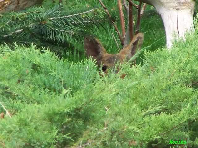Das chinesische Wasserreh wurde in letzter Zeit wieder zum Phantom. Heute blinzelte es durch die Zweige hervor. Zumindest ein Teil vom Kopf. Es ist jedenfalls noch da.