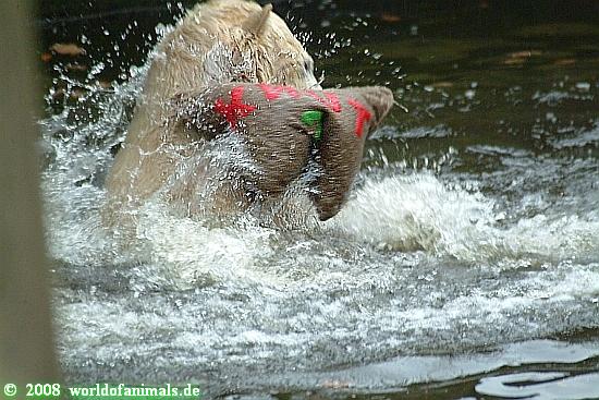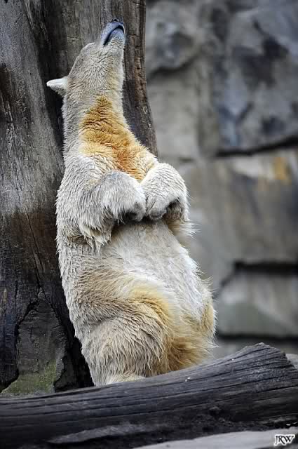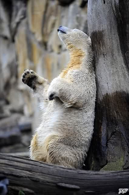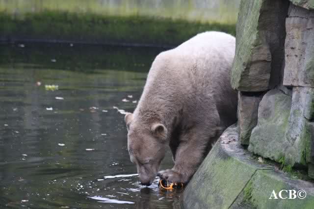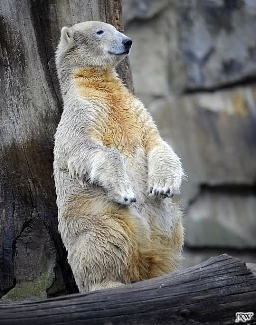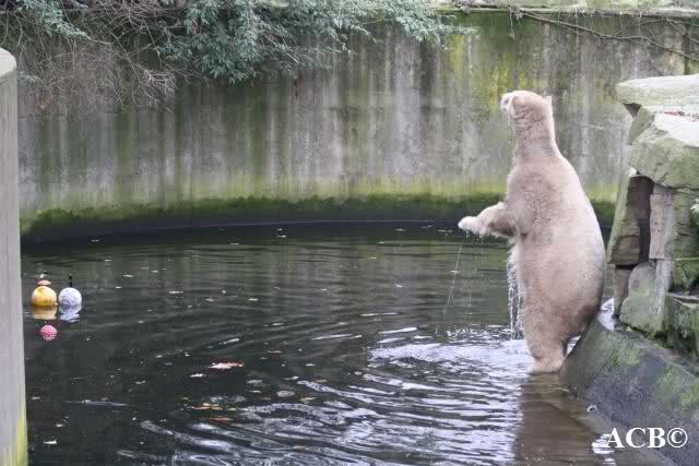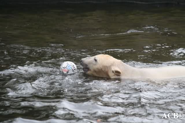 Und was sahen die Langschläfer am Sonntag Nachmittag ? Sie sahen einen ausgelassen spielenden zwei Jahre jungen Eisbären. Er zeigt weiterhin ein absolut natürliches Verhalten. Er ist weder auf die Besucher geprägt, noch macht er sich zum Clown. Das wird auch der Koordinator aus Holland zu sehen bekommen.