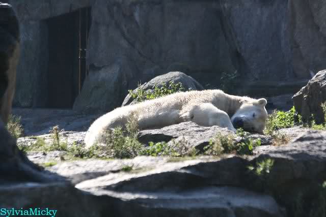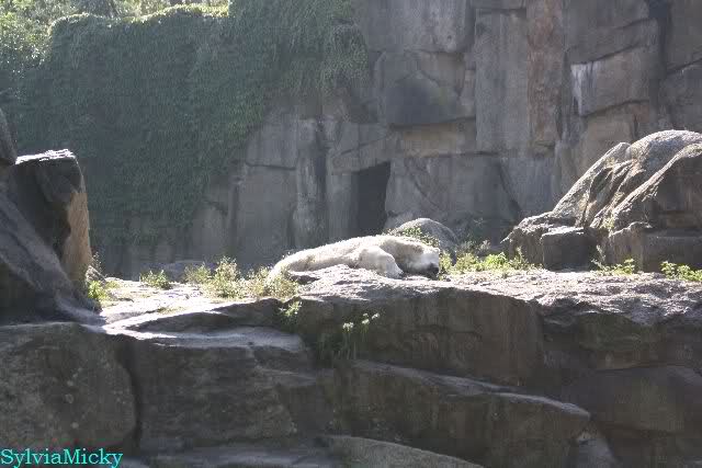 Dann konnten wir heute Knut bei seinen Aerobic Übungen beobachten. Er wälzte sich genüsslich auf dem Felsen. So wie in alten Zeiten, nur damals war es schwarzer Sand. Gegen 17:30 wurde sein Höhleneingang geöffnet. Gaaaanz langsam ging er Richtung Eingang. Gaaaanz lang machte er sich um vorsichtig in die Höhle zu schauen.