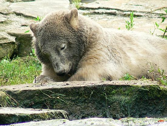 Ich bin gerade aus dem Zoo zurück. Als ich gegen 19:00 bei Knut ankam, war es noch ziemlich voll dort. Er lag zwischen den Pflanzen und schlief. Das Entchen schwamm seine Runden.Fliegen kann sie mit den winzigen Flügelchen noch nicht. Etwas später wurde Knut wach und beschäftigte sich mit Gartenarbeit, und gegen 20:00 kam er den Felsen hinunter und nach einigem Hin und Her ist er dann ins Wasser gesprungen. Einige Tauchgänge, dann kurz die kleine Ente gejagt und eine halbe Stunde schwimmen war vorbei. Anschließend hat er sich dann sofort in abendliches schwarz getaucht. Heute war er Kohlen-Bär.