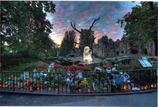 Ich denke, zur Erinnerung an Thomas Dörflein paßt das Foto ganz gut, dass Doris und Jessie aufgenommen haben. Belinda hat dazu beigetragen, dass Knut auch einen Blick über die niedergelegten Blumen zum Gedenken an seinen Papa, unter dem stimmungsvollen Himmel werfen kann.