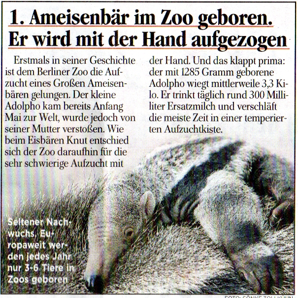 Erstmals in seiner Geschichte ist dem Berliner Zoo die Aufzucht eines Großen Ameisenbären gelungen. Adolpho, so heißt das Jungtier, kam bereits Anfang Mai zur Welt, wurde jedoch von seiner Mutter verstoßen. Jetzt springen wie bei Eisbär Knut die Pfleger ein.