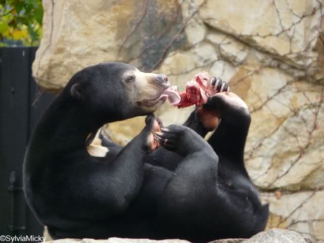 Herr Röbke bestückte die Anlage der Malaienbären reichlich mit viel Obst und Brötchen. Die Brötchen wurden in die Felsennischen drapiert und die Bäume wurden mit Pflaumenmus bestrichen und Fleisch gab es auch.