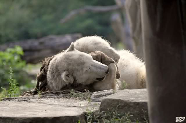 Dann besuchte ich noch mal die Braunbären. Eine Bärin war im Wasser, dicht an der Scheibe. Sie aß mit großer Begeisterung ständig Entengrütze. Sie schaufelte es regelrecht in sich hinein und konnte nicht genug bekommen. Berni lag derweil am Rand des Grabens auf der Bärenhaut und kaute auf einer Pflanze herum. Als einer der Wölfe zu dicht an ihn herankam, brüllte er ihn furchtbar an. Das wirkte. Berni hatte Ruhe vor den Wölfen. Übrigens ist mir heute aufgefallen, dass Berni wunderschöne Augen hat. Er hat unglaublich lange Wimpern. Das habe ich noch nie zuvor bemerkt.