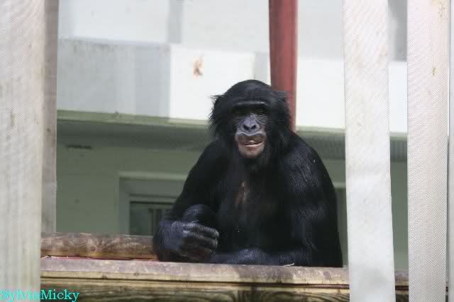 Die Zusammenführung der Bonobos hat gut geklappt. Der Neue saß zwar im rechten Käfig aber die Tür zum anderen Käfig war auf