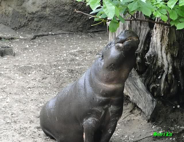 Das Zwergflusspferd holte sich Blätter vom Baum.