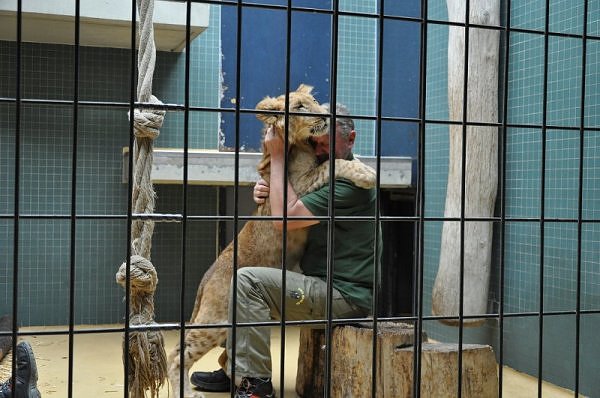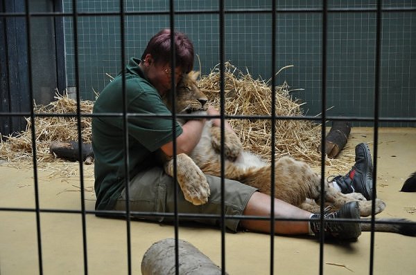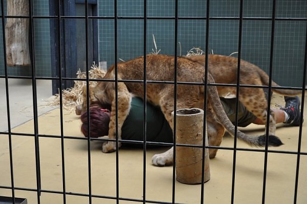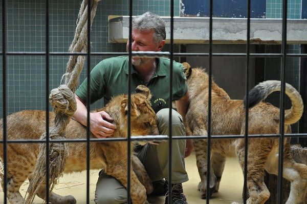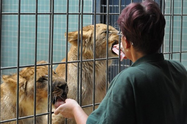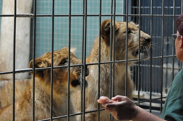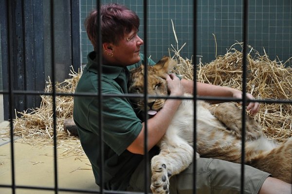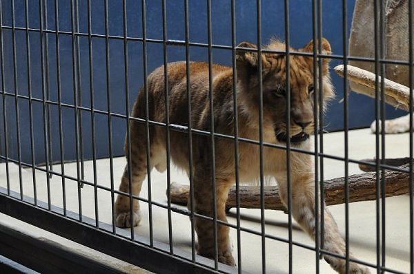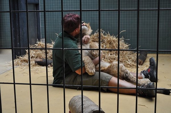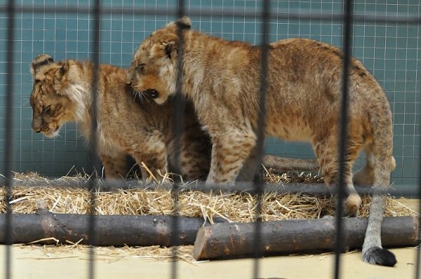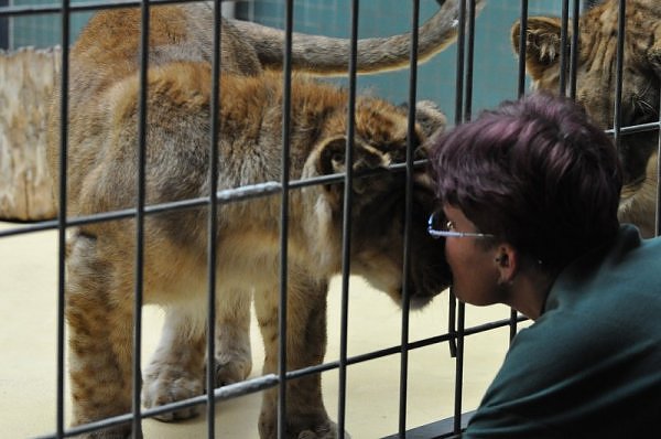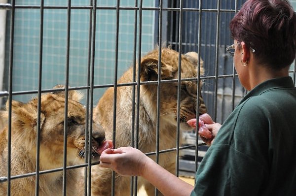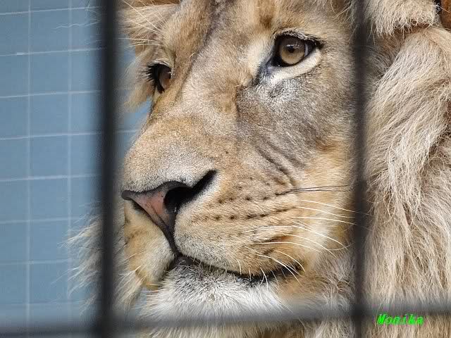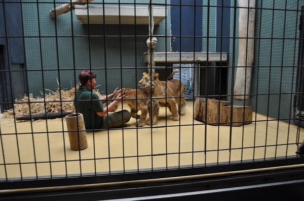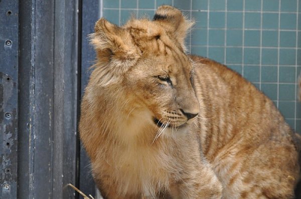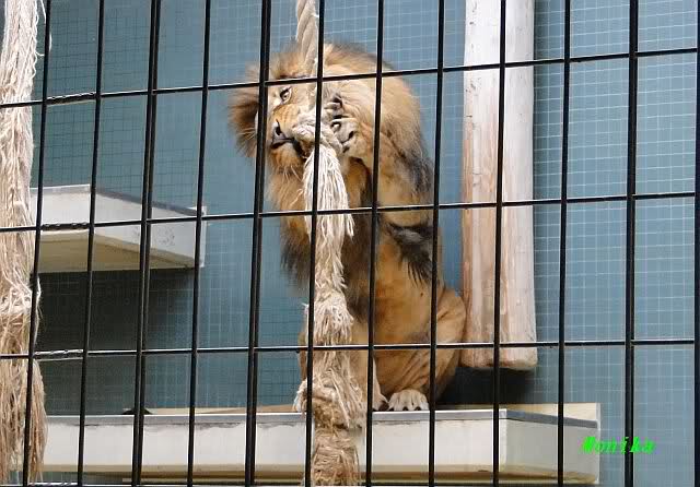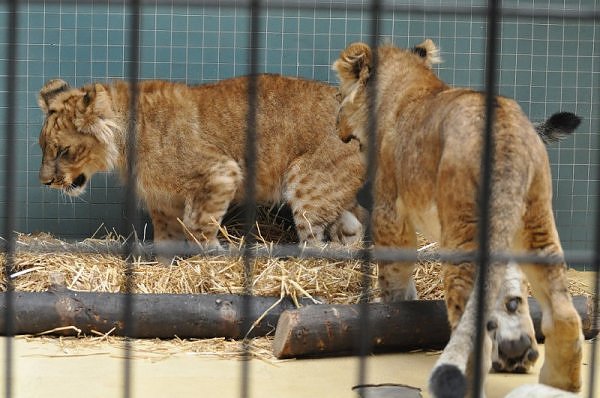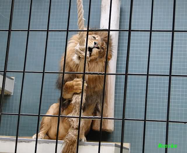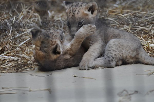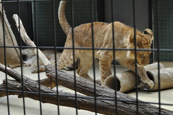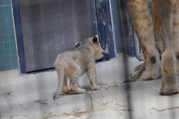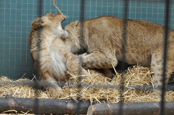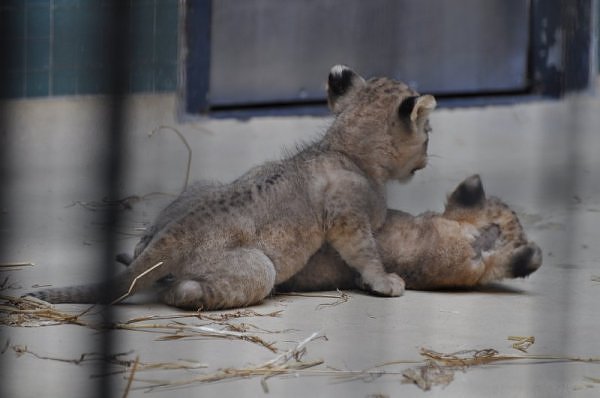 Das kleinere Kind hat eine kahle Stelle am Kopf und hat auch die Schwierigkeiten beim Laufen. Bei ihm rutschen alle vier Pfoten auseinander. Das Kind versucht trotzdem zu rennen. Die beiden Kids sind aktiv und bewegen sich viel. Vormittag lagen sie bei Aketi. Um die Fütterungszeit ist Aketi sehr unruhig. Die Kinder laufen zwischen ihren Beinen. Sie passte auf, aber diese Zeit ist für die Kleinen gefährlich. Ich drücke die Daumen, dass die kleinen Löwen groß und kräftig werden. Hoffentlich werden sie auch in einen anderen Zoo kommen.