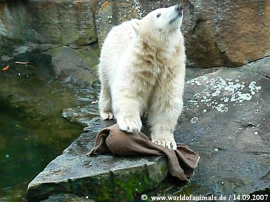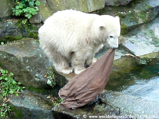 Have visited Knut at September 14th, 2007 at evening. Knut looks very happy today, he got a sack with toys today. He was playing with the plastic Ring and with the sack, he didn´t find out how to open the sack with the ball. He looked very happy and I`m sure he is feeling good.