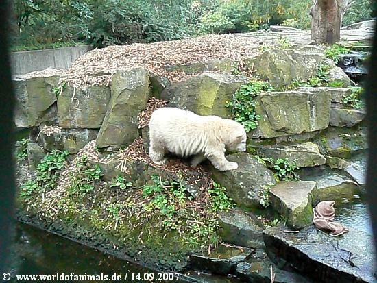 It began to rain. Knut don´t like rain. So he stand up, he did remember that he has new toys and did climb down to the water were the sack was. / Es begann zu regnen, Knut mag keinen Regen. Er erinnerte sich das er neues Spielzeug hat und kletterte zum Wasser herunter, wo der Sack lag.