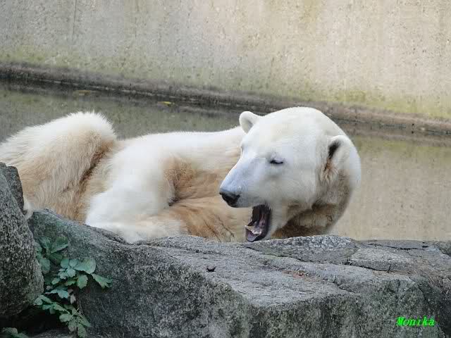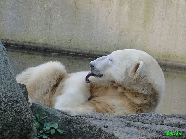 Nach der Fütterung ging er auf die Anlage, beobachtet von Kati. Sie kam dann auch angerannt. Es gab Gefauche und Gebrumme. Die beiden anderen kamen natürlich auch an. Knut blieb aber standhaft und die drei trollten sich. Er blieb eine Weile an der Mauer liegen, beschloß aber dann doch auf die vordere rechte Ecke zu gehen. Da lag er noch, als ich um Mittag den Zoo verließ.