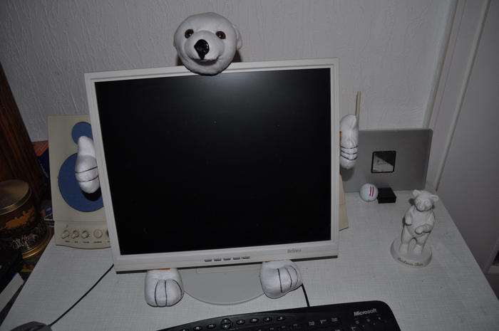 Birgit, wo haste denn das wieder gefunden ? Herrlich dieser Eisbär, der den Monitor hält. Ich hatte damals mal sowas mit Tigerkopf. Aber Eisbär ist cool.