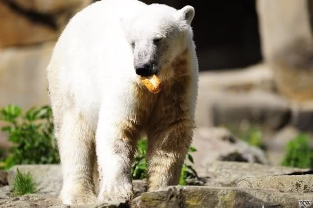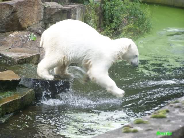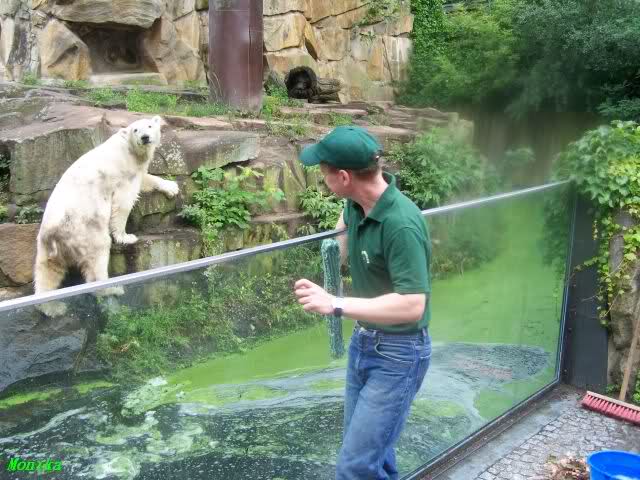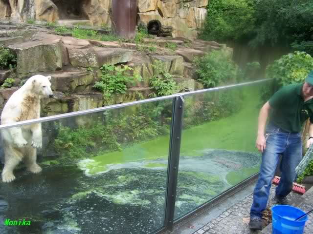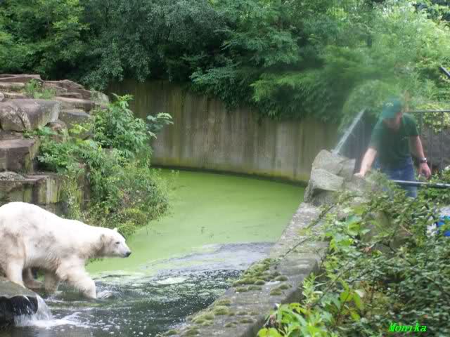 Eine Anmerkung habe ich allerdings: Da die Glasscheiben bei Knut geputzt worden sind, warum hat man da nicht gleich auch das grüne Wasser abgelassen und erneuert? Schliesslich kam ja nicht irgendein Team in den Zoo, sondern das ZDF mit Hannes Jaennicke. Da hätte man einen sauberen Knutgraben erwarten können. Naja, alles ist eben nicht machbar