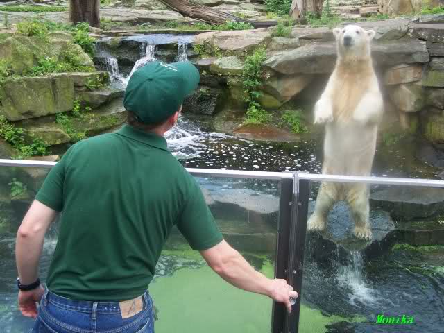 Es wurden nicht nur die Scheiben geputzt, sondern auch der Schmutz vor der Scheibe entfernt. Für Knut war dies natürlich sehr interessant. Genauso der Promibesuch. Das ZDF filmte. Die Sendung wird im Januar ausgestrahlt. Über das Interview kann ich nichts berichten. Ich habe lieber Knut fotografiert. Gefüttert wurde Knut von einem jungen Pfleger, der auch die großen Eisbären fütterte. Er nahm sich Zeit und es gab reichlich zu essen. Zum Abschluß gab es die frische Mittwochslachsforelle.