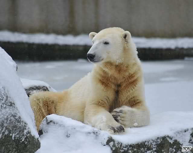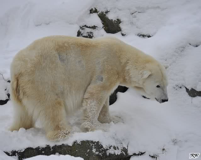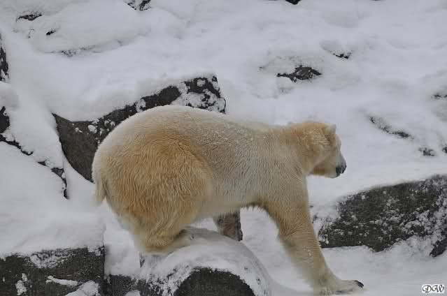 Ich kam leider zu spät, sah also nicht, was die Besucher am frühen Morgen zwischen Knut und Tosca erlebt haben, schade. Schöne Filme hast Du mitgebracht, Monika! Es schneite ununterbrochen, ein richtiges Eisbärwetter! Ich filmte danach Tosca, die sich sichtlich wohl fühlte.