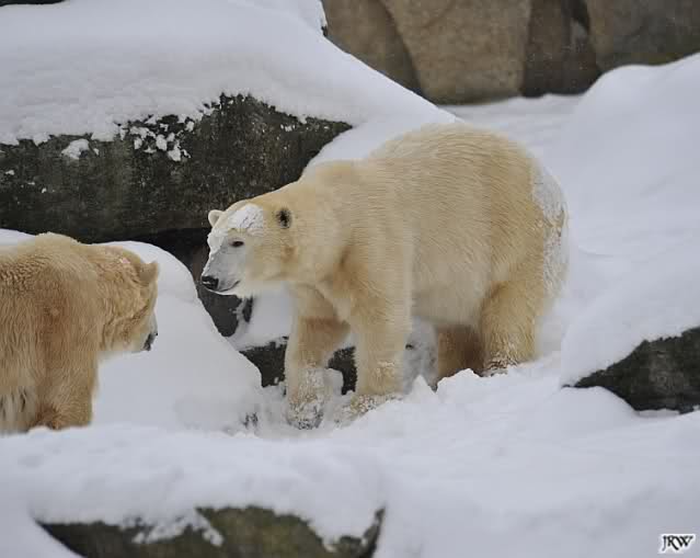 Thank you so much for these beautiful photos and video! Knut and Tosca look so much alike, it is hard for me always to tell them apart (unless I see the toenails!). I find it interesting that (1)Tosca was purportedly Thomas's favorite and (2) he introduced Knut to her and the others when Knut was very young (inside the building, nothing but bars in between so she would have been able to smell him). (3)Now, almost four years later Tosca is the first to approach Knut and in a way that he perceives (accepts) as friendly..... Anyway it is wonderful to see that all four bears appear to be happy and not stressed by this new development.