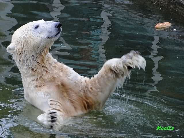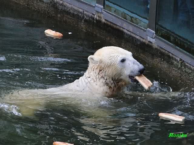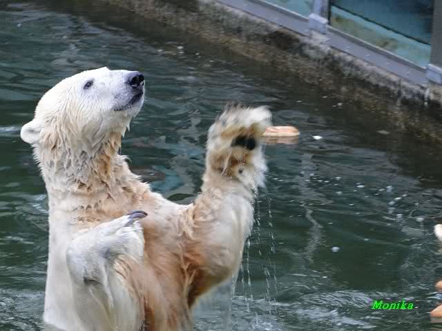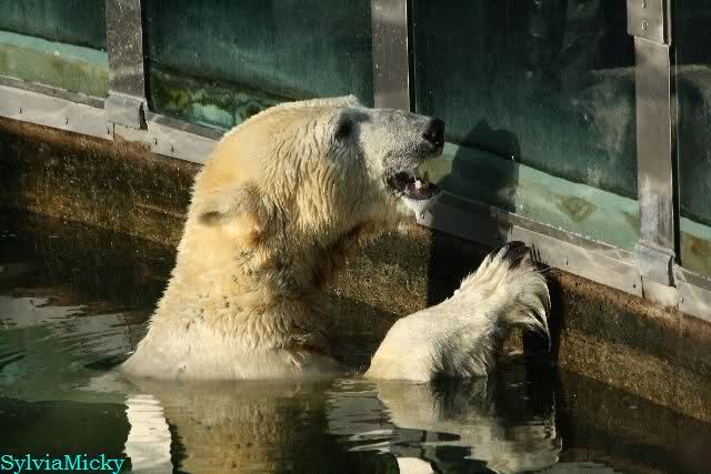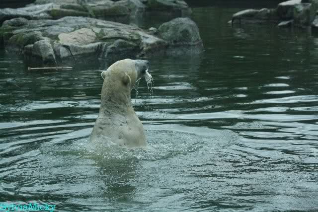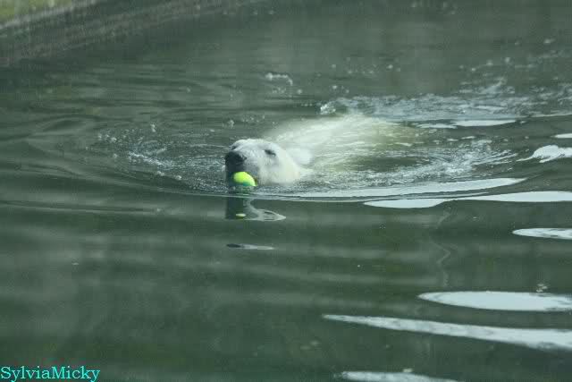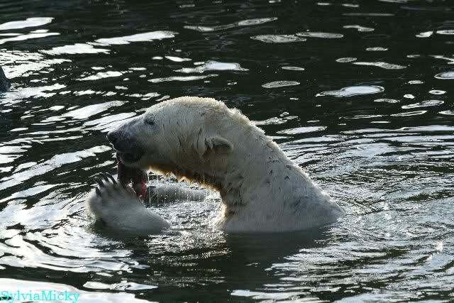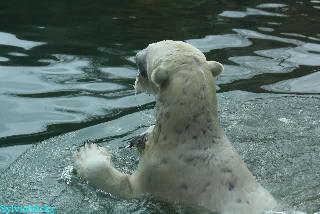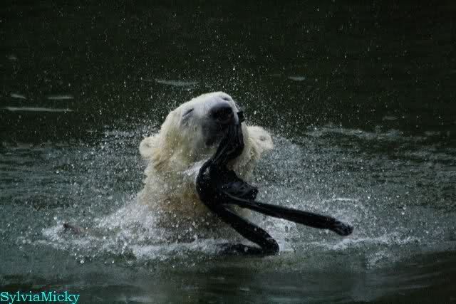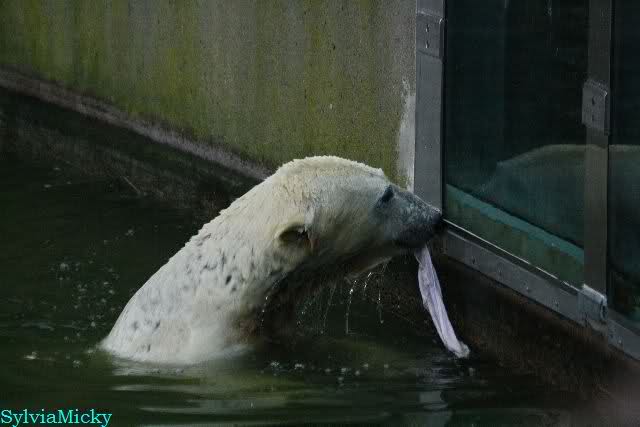 Ludmilla, Knut kaute gestern im Wasser auf irgendetwas aus Weichplastik und fraß auch Teile davon. Danach hatte er viel Schaum am Maul. Er schüttelte den Kopf und der ganze Sabber flog an die Scheibe.