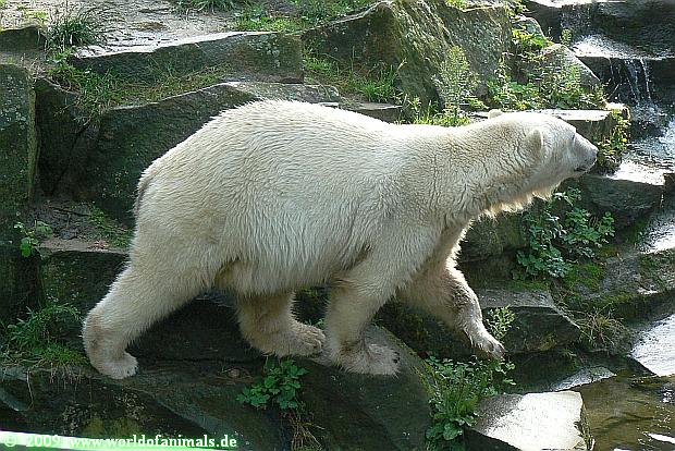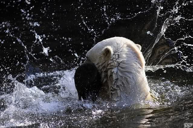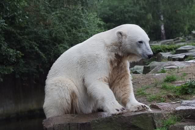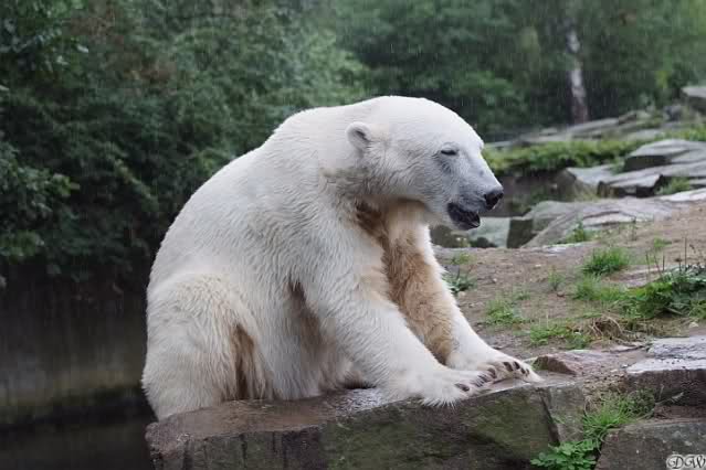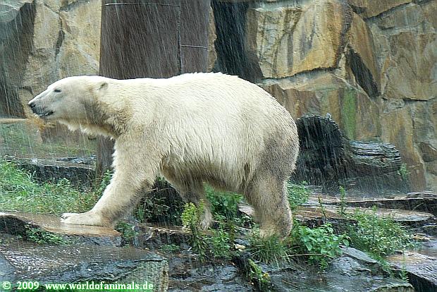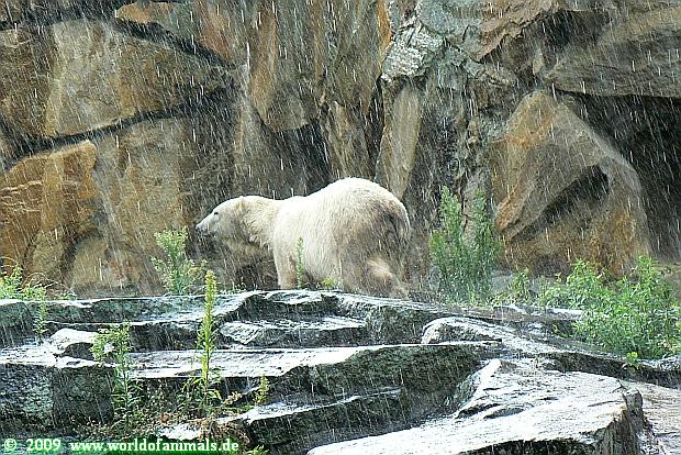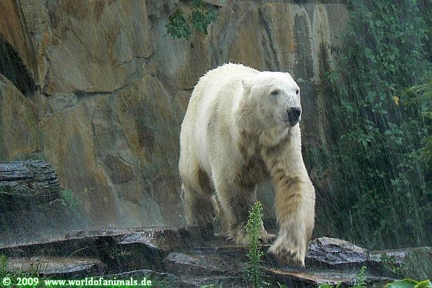 Doch aus heiterem Himmel begann plötzlich ein starker Platzregen, der nicht nur Knut sondern auch die vielen Zoobesucher überraschte. Es gab zwar weder Donner noch Blitz aber Knut rannte wieder voller großer Aufregung über die Anlage. Vielleicht trieb ihn der Gedanke das es ja bei solchem starken Regen donnern und blitzen könnte dazu an. Ein Tier, das die Ohren ganz eng anlegt ist in Aufregung. Jeder Katzen-und Hundebesitzer weiß das.