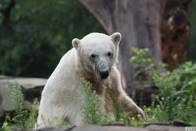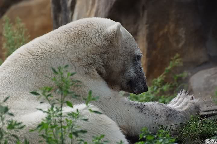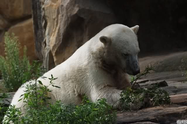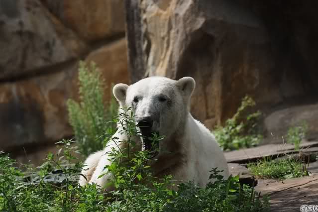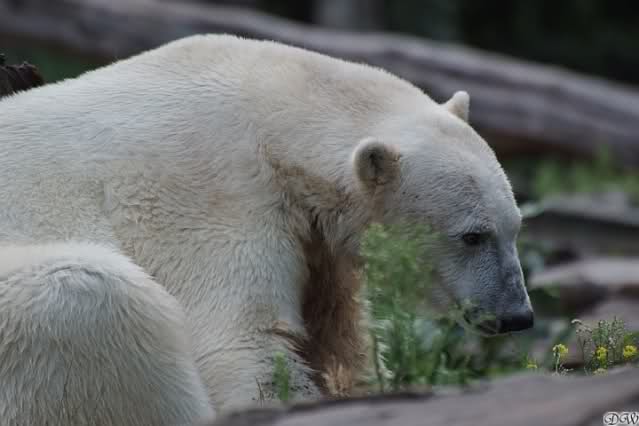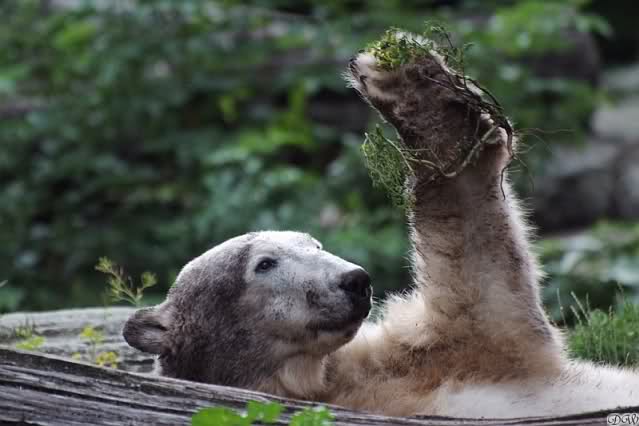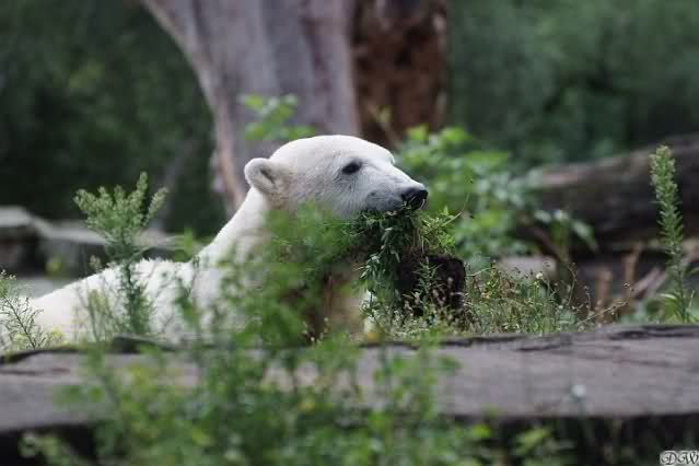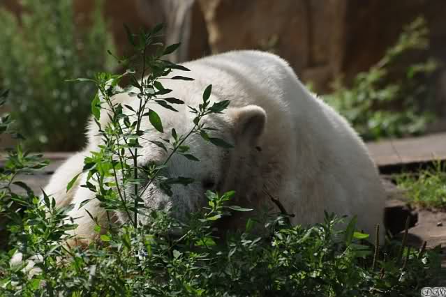 Knut scheint sich von dem gestrigen Gewitter wieder erholt zu haben. Als ich heute Morgen im Zoo ankam, spielte er schon mit seinem Nackthuhn im Wasser, bis er dann irgend etwas entdeckt hat und interessiert guckte und sich immer wieder hinstellte. Ich vermute, der Fuchs war wieder in der Nähe.Er fing dann ziemlich früh an zu laufen. Seine neue Lieblingsbeschäftigung scheint ja das pflücken von Gräsern zu sein. Als er sich in seiner Schlafkuhle niederlies, zupfte er immer wieder ein paar Gräser, bis er dann einschlief.