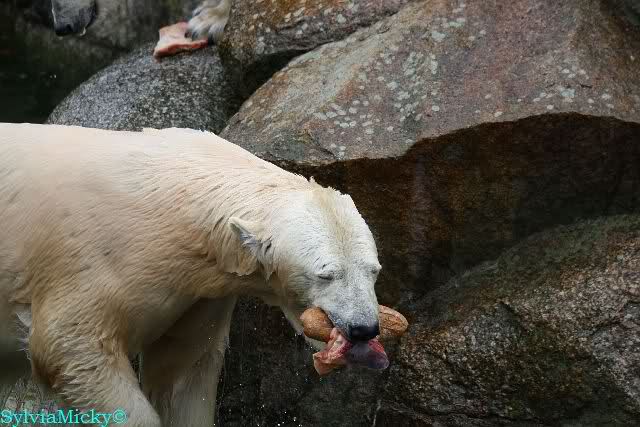 Heute wurden die Anlagen von Knut und Gianna und den großen Eisbären, wie vorangekündigt, sauber gemacht. Eine gute Möglichkeit die Großen bei der Fütterung auf der kleinen Anlage zu sehen.