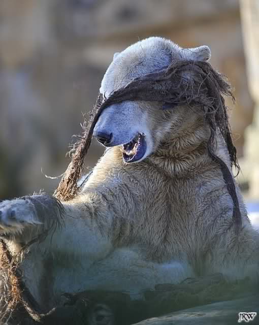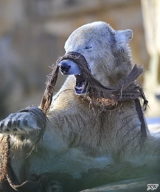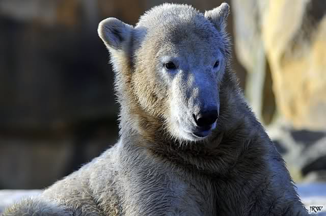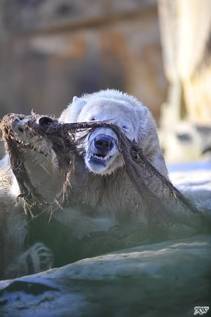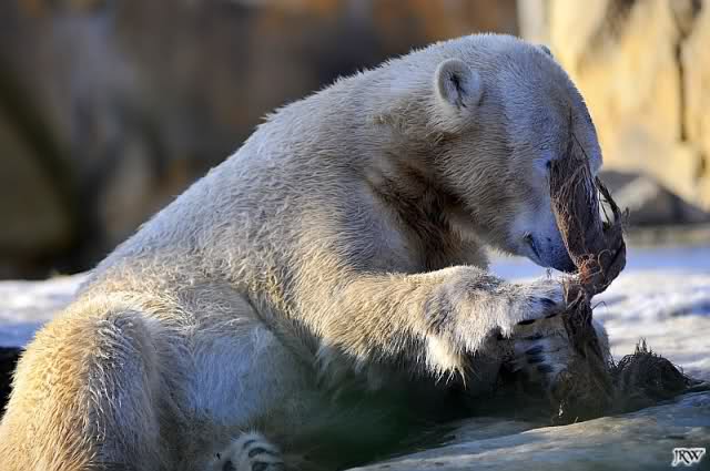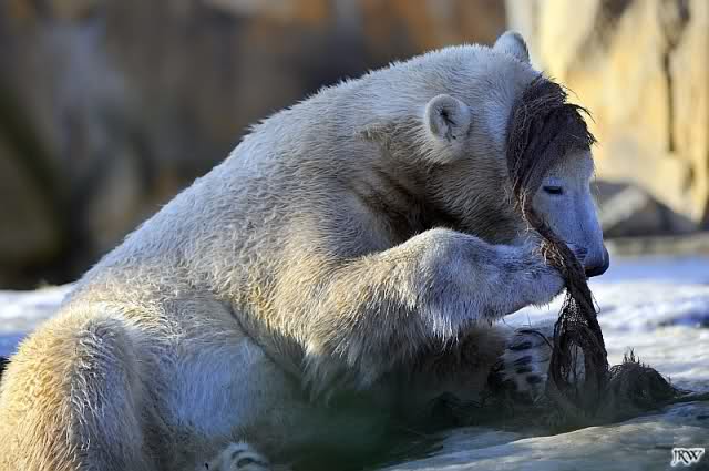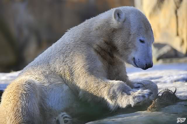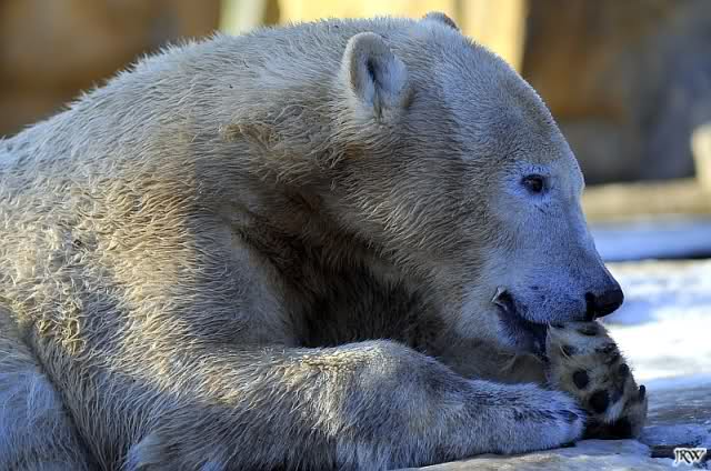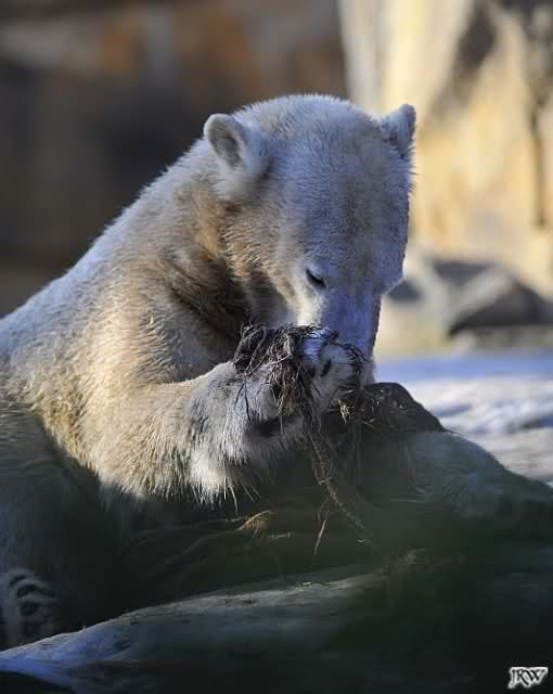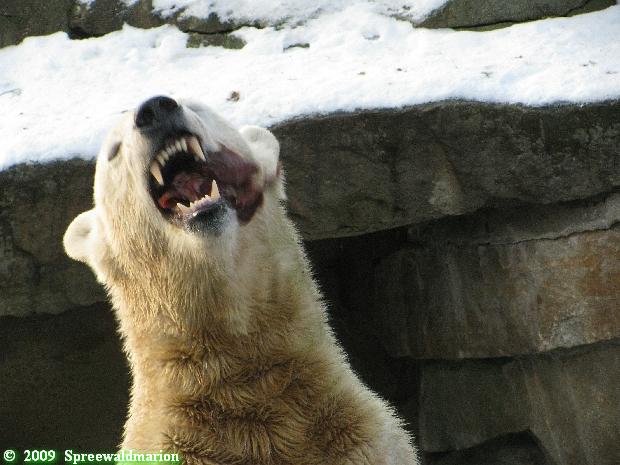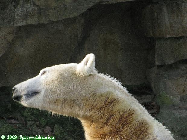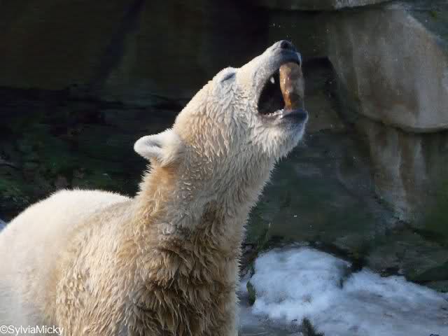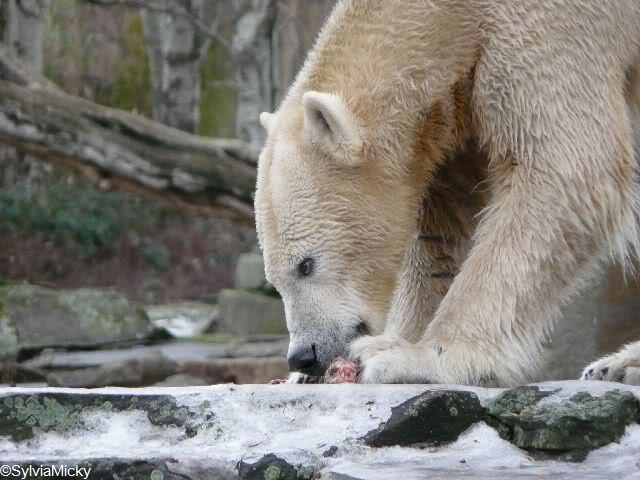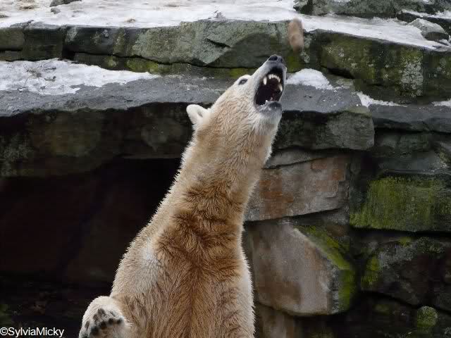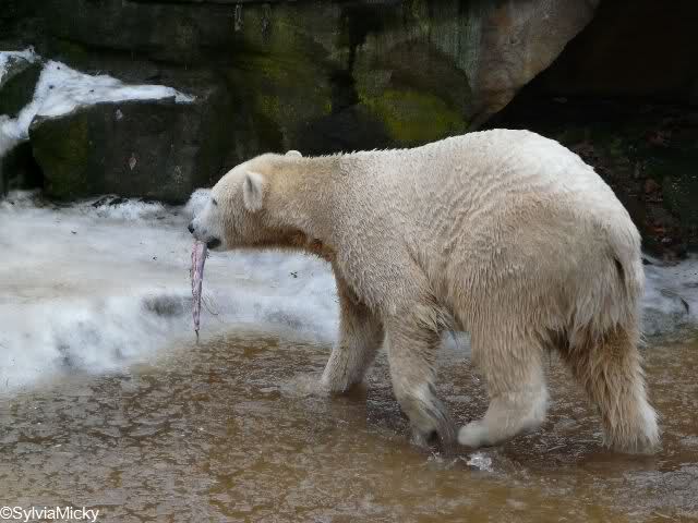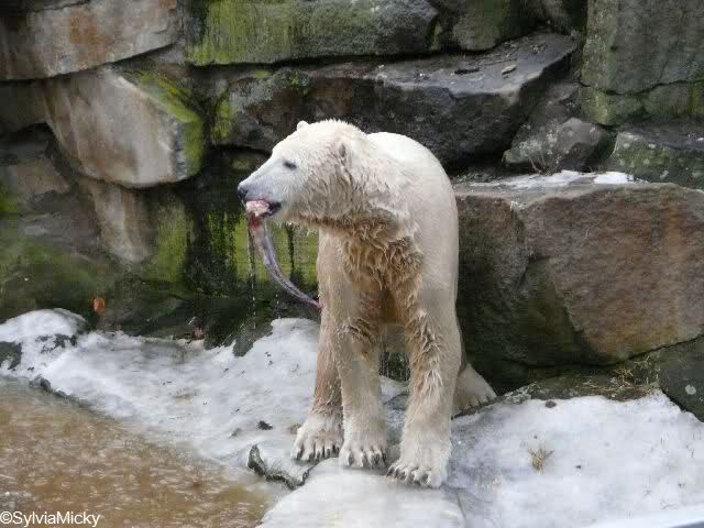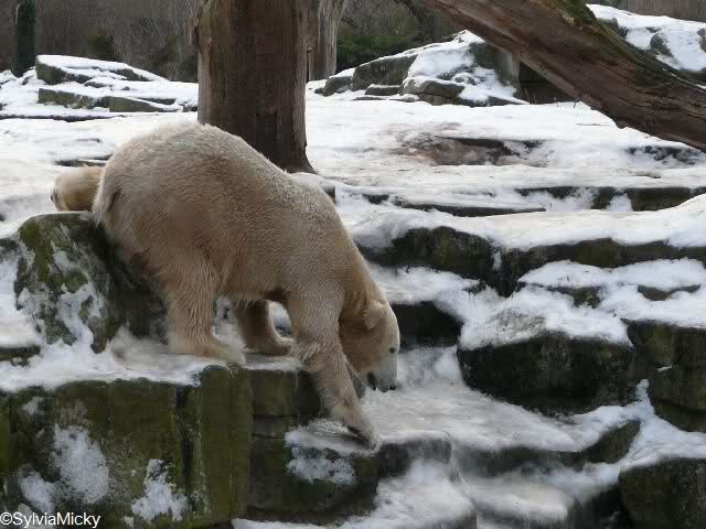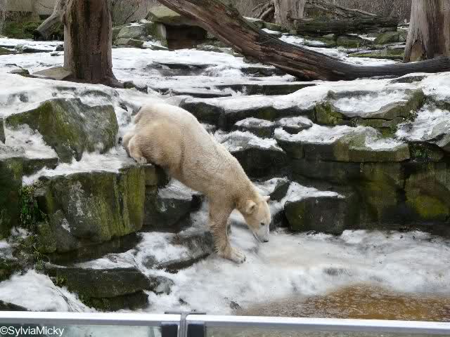 war gestern auch für nur eine Stunde (Rückenprobleme)im Zoo und konnte den rutschenden Knut beobachten.Das Problem ist m.E. nicht der Aufgang am Wasserfall, sondern die Kanten am Gehege wo es über die Klippen abwärts geht..... Manchmal konnte die Maus erst im letzten Moment stoppen...Dann hatte er die Nase voll und räumte erst mal die Nische auf- da wurde zunächst mal per Tatzenhandfeger der Müll weggescharrt- und dann machte er es sich nach Katzenmanier gemütlich... mehrmals gedreht bis die Lage stimmte. Kann aber auch sein, dass die Besucher zu laut waren und er ein wenig Ruhe wollte. Ich ging schweren Herzens....Hoffe, dass nun das meiste Eis getaut ist, streuen ist sicher schwierig. Sand wird schnell weggespült, Split kann er sich eintreten und Salz wäre sicher ganz falsch....Dieses Gehege ist wohl doch nichts für einen Eisbären.....Am Wasserfall gehts nicht so tief hinab---aber an den Klippen kann er sich böse verletzen