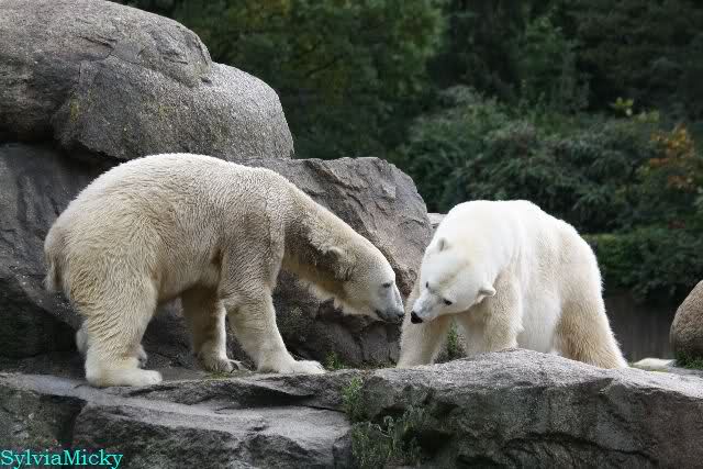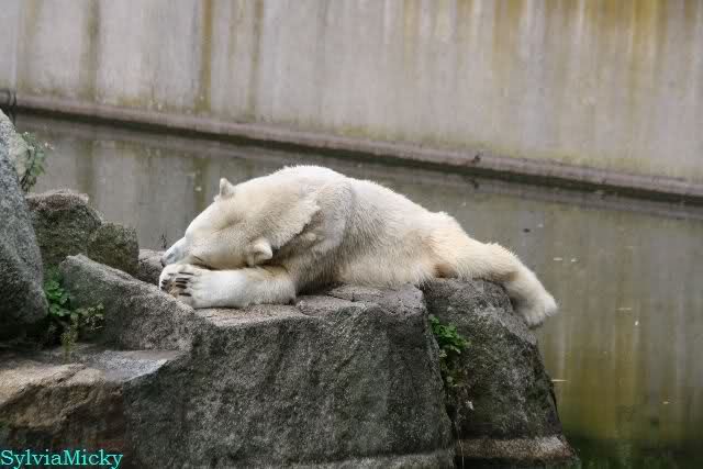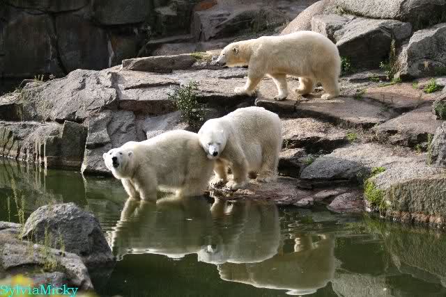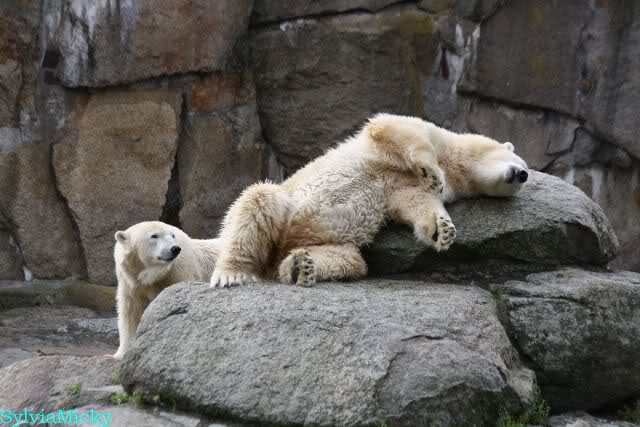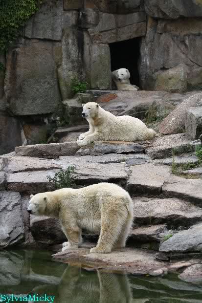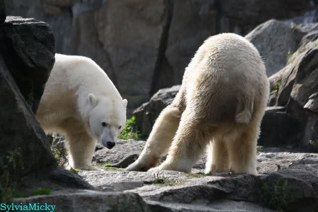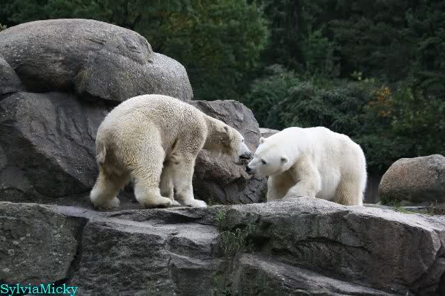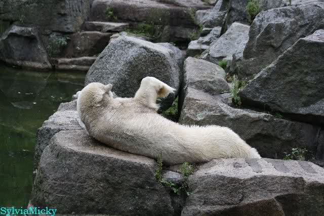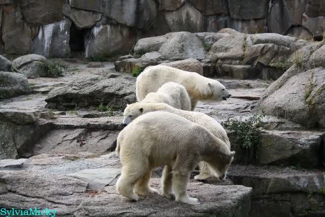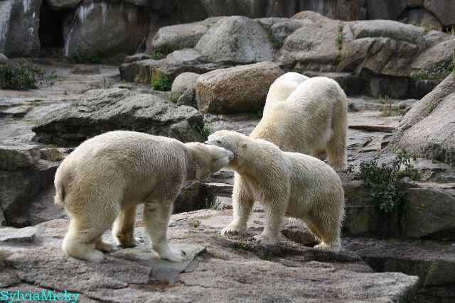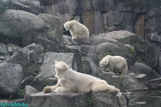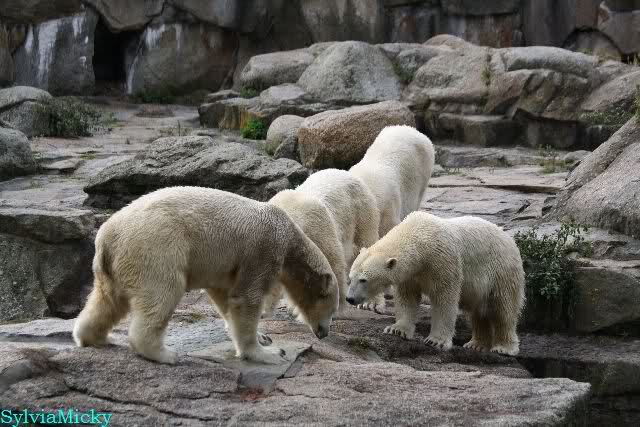 Im Laufe des Vormittags ging Kati mehrmals ziemlich schnell auf ihn zu. Sie brummte, Knut auch aber er blieb stehen. Sie trollte sich dann. Als er vorne auf dem Felsen lag kamen alle drei Bärinnen auf ihn zu. Mein Gott, war ich ängstlich. Aber Knut nicht. Er stand langsam auf und brummte die drei an. Sie gingen dann auch weg.