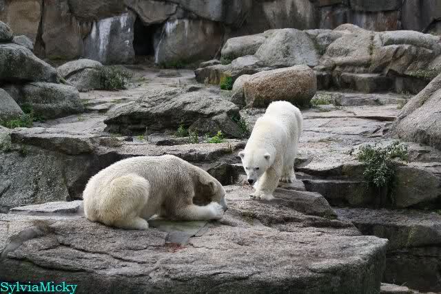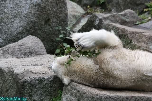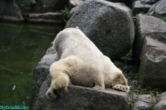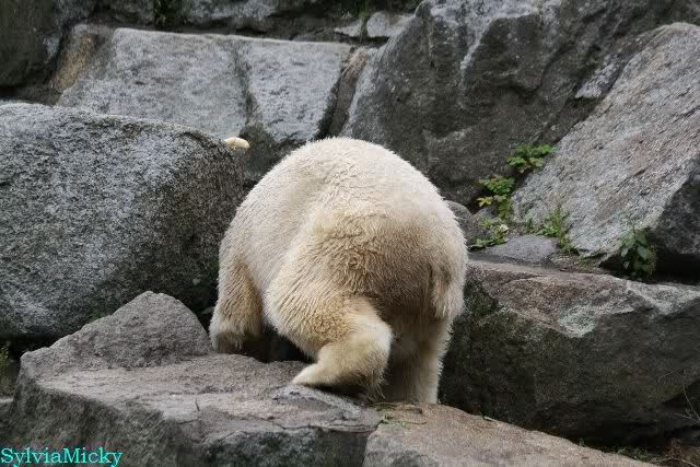 Entweder sind die Beschäftigungsmaterialien für die Besucher unsichtbar oder sie verschwinden während des Fotografierens oder wir haben Tomaten auf den Augen und wollen die Materialien nicht sehen oder - heaven forbid, ich mag es mir nicht vorstellen - die Anordnungen des Zoodirektors verschwinden auf dem Weg von der Verwaltung bis zu den Pflegern. Es gibt von dort jedenfalls die Antwort auf die Frage, ob dieses oder jenes Naturmaerial für die Tiere am Bärenfelsen mitgebracht werden darf, die Antwort: "Sie wissen doch ich darf nichts geben".