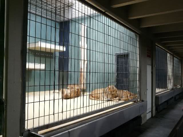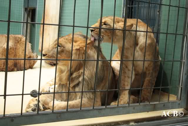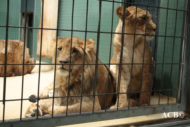 Gestern Nachmittag lagen beide jungen Löwen dicht gedrängt in einer Ecke ihres Käfiges und mussten die extreme Lautstärke sowie das Blitzlichtgewitter der Besucher über sich ergehen lassen.