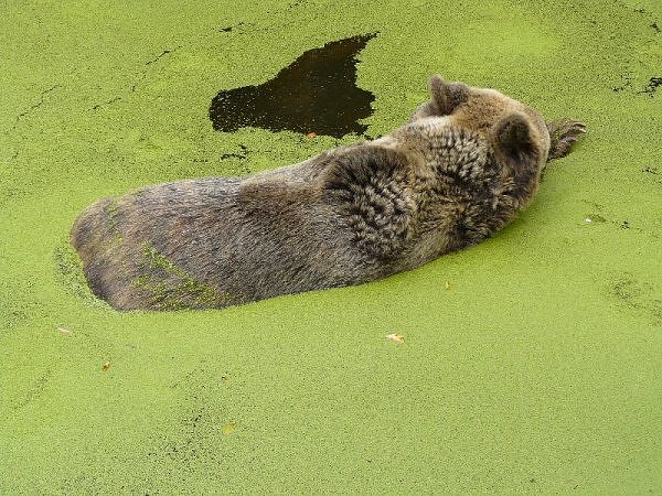 Now you can see where my questions were leading. Why does not the large polar enclosure have duckweed? The other enclosures do (Knut's small one and the brown bear as Ludmila pointed out). Duckweed is spread by ducks and other wading birds carrying the plant from one pond to another. (They also carry parasites, snail eggs, etc. from one pond to another.) Is there never a duck or other bird that goes from one enclosure to the other? Not likely. There is enough sun. It does not sound like there is enough water movement in the large enclosure to preclude duckweed from thriving at least in "out-of-the-current" places. In videos, I don't see the bears having to hurry after the walnuts or croissants as they float by in the "current."