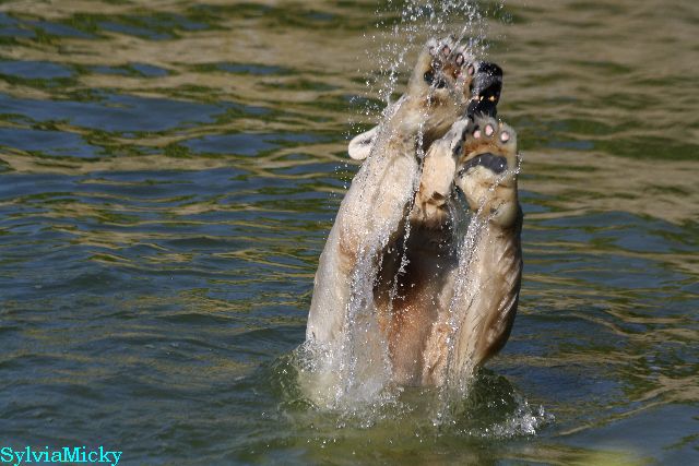 Heute früh tobten Tosca und Nancy im Wasser. Dann wollte Tosca nicht mehr. Nancy fand dann den Restball mit dem sie vergnügt durchs Wasser schwamm. Sie schmiß ihn hoch, sprang nach ihm und tauchte mit ihm ab. Ein kleines Stück Ball, der so viel Freude schenkt.